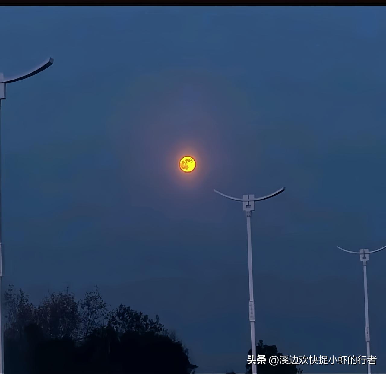 刚去接孩子下晚自习回来, 突然抬头看到这轮月亮, 黄澄澄的像个小灯笼挂在天上, 和路灯的造型还挺呼应, 感觉它们在“隔空对话”似的。 最近总觉得时间过得快, 忙起来都忘了抬头看看天。 其实生活里这种小景色挺治愈的, 偶尔停下脚步瞅瞅, 心情都能变敞亮。 希望以后能多留点时间给这些不经意的美好~ 跟灯一样的月亮