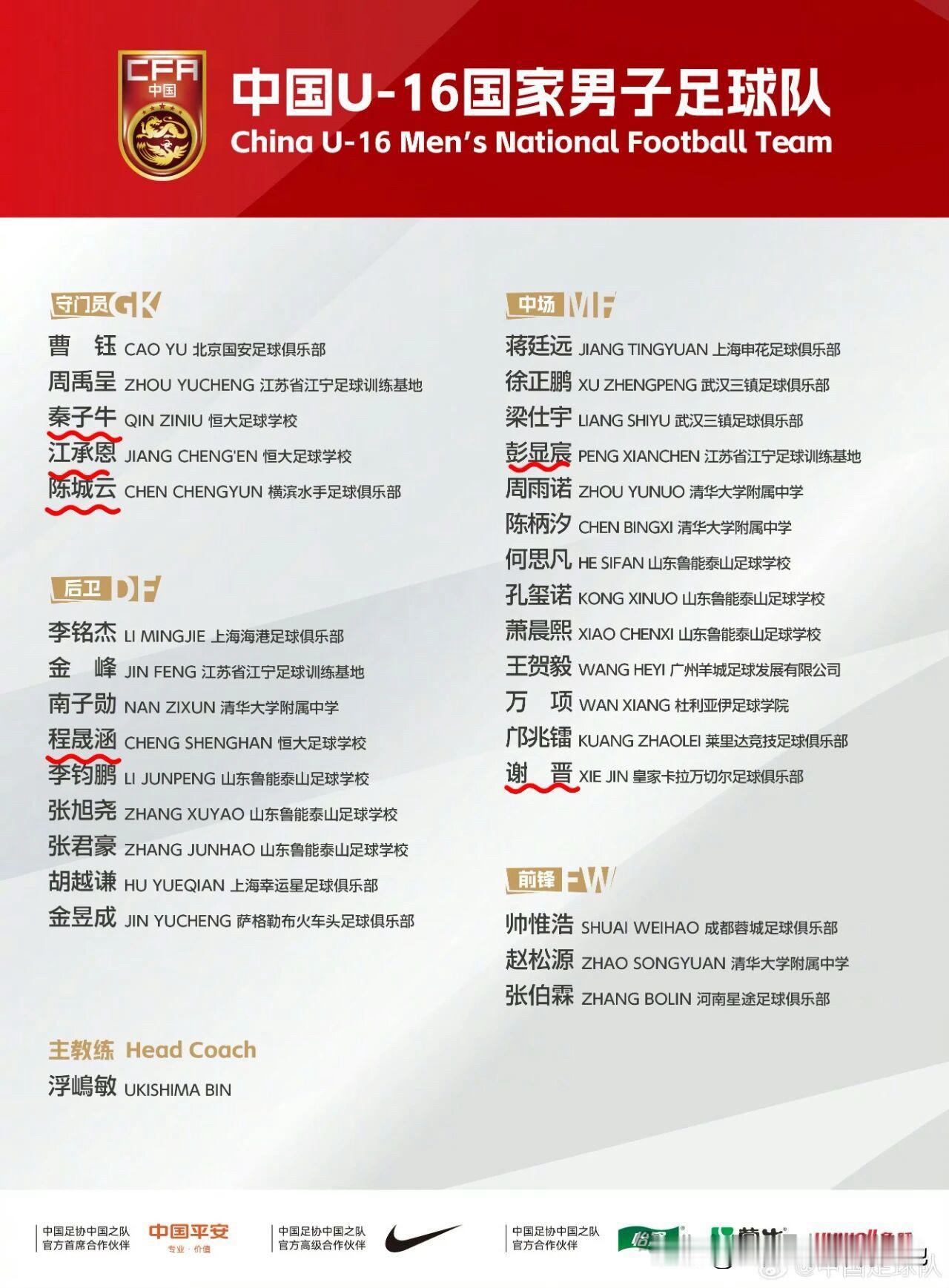 再度恭喜@恒大足球学校 ,在U15夺冠后,又有喜讯——中国足协公布U16国家男子足球队第五期集训名单,恒大足校培养球员秦子牛、江承恩、程晟涵、彭显宸、谢晋、陈城云入选,其中U15梯队江承恩跳级入选[赞] 这次,学校培养6名球员入选U16国少备战U17亚洲杯预选赛集训名单,现在感觉国字号的青年组别,几乎每队都有数名足校成员,好事情啊,无论集体还是个人,未来中国足球就靠你们顶起一片天了,加油吧足球少年![鼓掌]