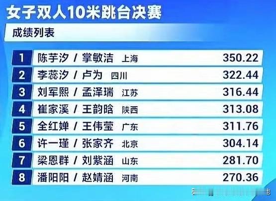 今天同样如此,终究综合实力更强的是陈芋汐的组合,全妹要不是最后一跳略有不足,应该也能登上领奖台拿一块铜牌的,所以说国内竞争真的太激烈了,比国外比赛更难。相信没有冠军,大家依然喜欢你,祝福你