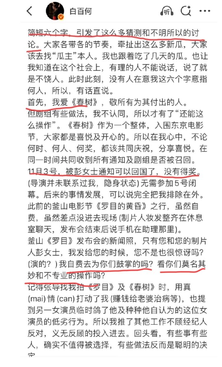 白百何发文回应“还能这么操作”风波,在文中,她讲述了自己在《春树》剧组遭受到的不
