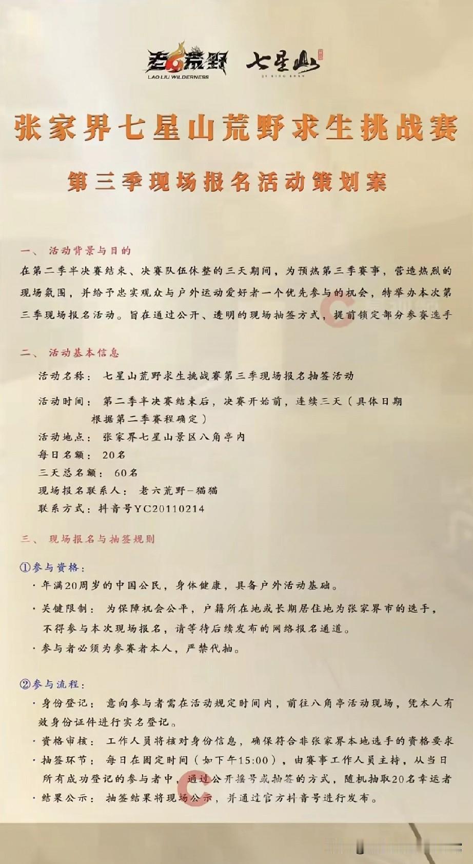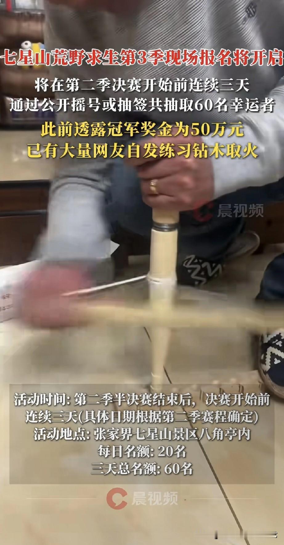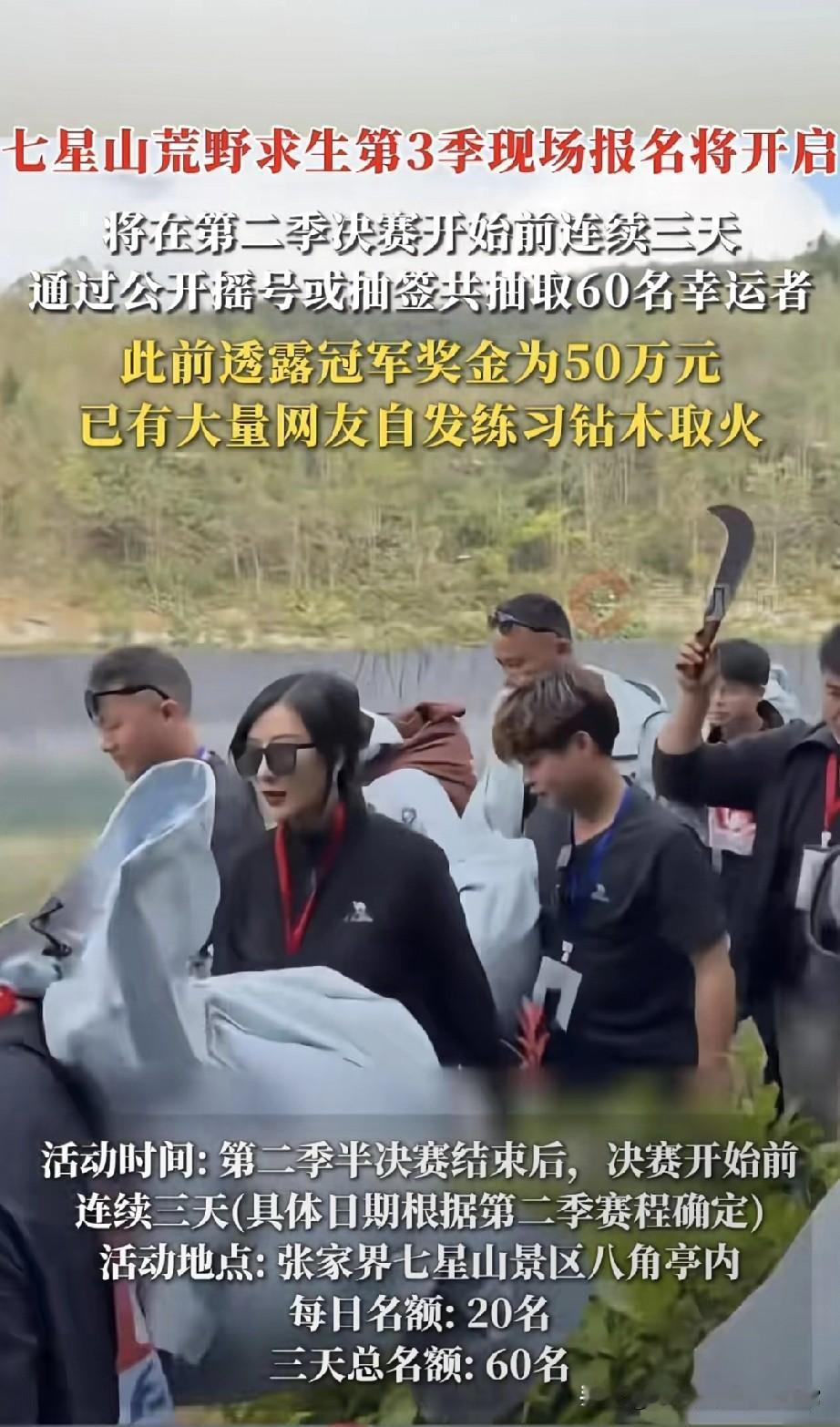 荒野求生第三季报名开始了,50万奖金引疯抢! 张家界七星山荒野求生第三季现场报名要开了,连续三天抽60个名额,冠军奖金直接砸50万! 现在网友都魔怔了——有人在家拿木头搓火星子,手都搓红了还喊“再练半小时”;还有人连夜翻《野外生存手册》,连怎么找野菜都背得滚瓜烂熟。 更绝的是报名规则:张家界本地人还不让现场报,得等网络通道。外地人为了抢名额,已经有人订了飞张家界的机票,就等半决赛结束冲现场抽签。 不过话说回来,这50万真这么好拿?钻木取火看着简单,真到深山老林里,怕是连找干柴都费劲吧?要是抽中了又不敢去,这名额岂不是白瞎?你们说,为了50万去遭这罪,到底值不值?