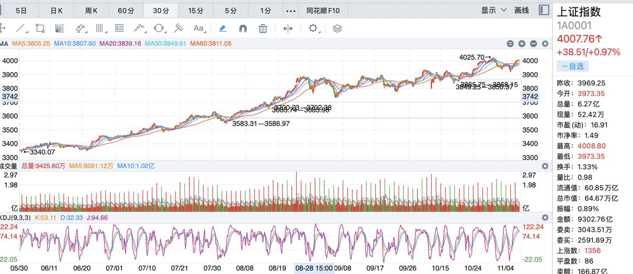 明天还是赚钱的好机会!今天大盘收复4000点,两天v型反弹上涨70多点,盘面上除了前期涨幅比较大的海南和福建板块,其他板块温和上涨,这样的走势还能继续上涨,这个时候耐心持股比减仓更加合理。 看好明天大盘继续震荡上行,如果明天大盘上涨不超过前期高点4025点,基本没有上行的压力,今天个股涨多跌少,大盘量能超过20000亿,比上一个交易日多1800多亿,放量良好,如果量能继续放大,创新高是正常的。 明天科技股和煤炭等资源股有可能继续走强,4000点以上继续突破,是一个很好的态势,对场外资金有吸引力,从而带动新的突破!形成自己的判断和操作体系,是股市盈利的根本!