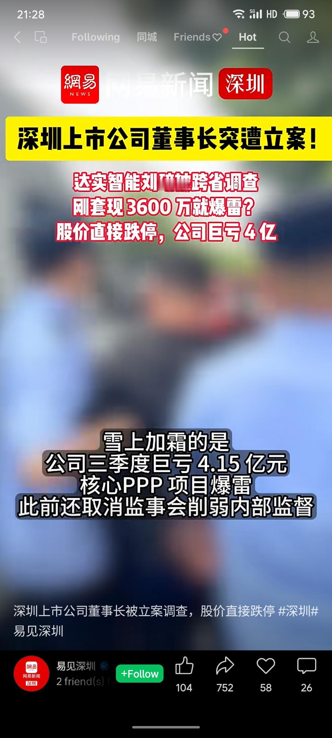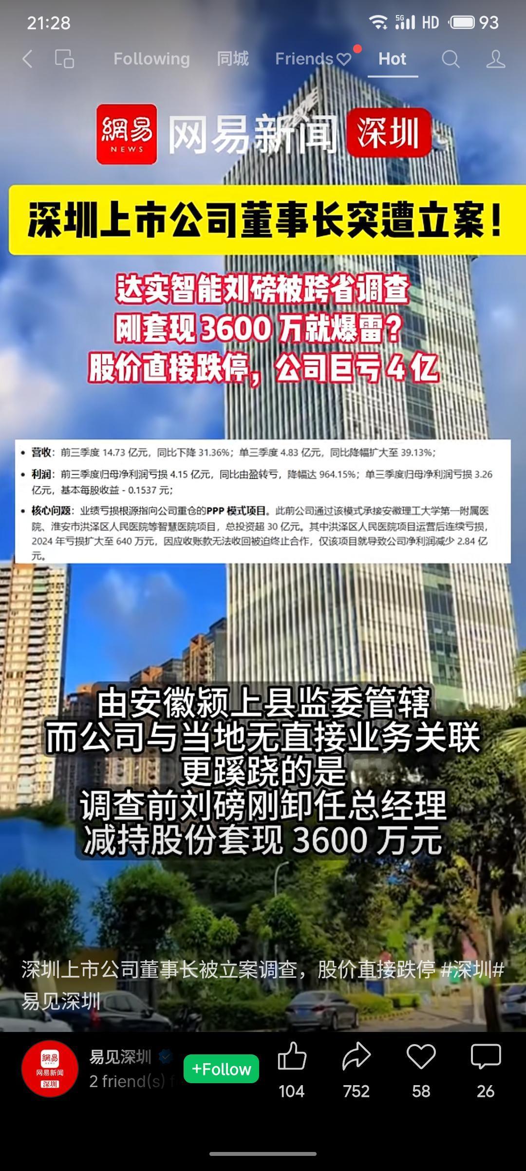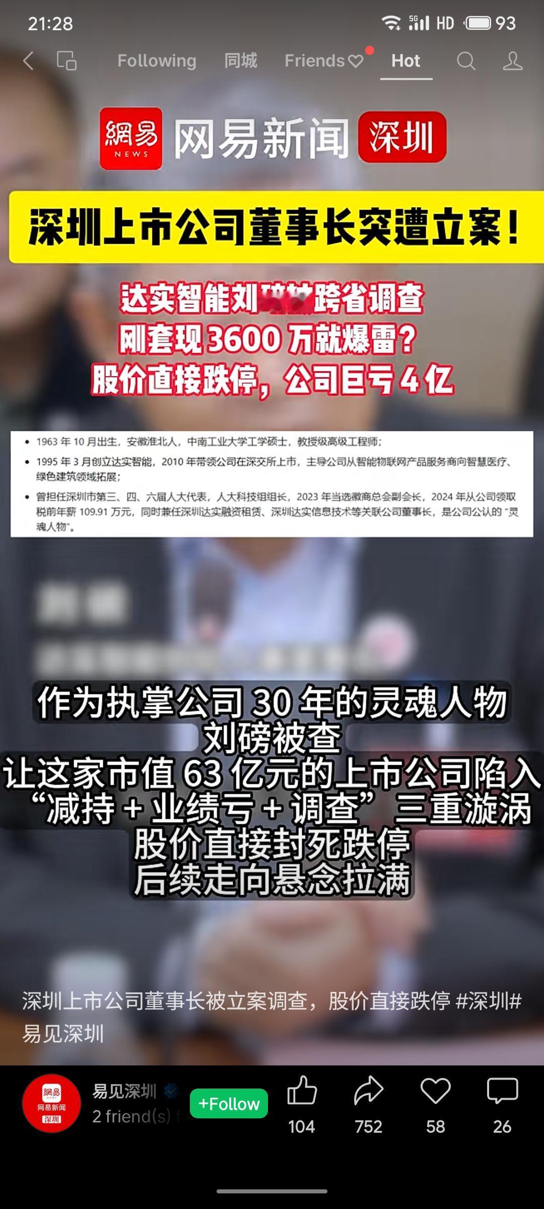 深圳达实智能董事长刘磅近日被跨省立案调查。其于调查前刚减持股份套现约3600万元。公司目前陷入困境,前三季度巨亏4.15亿元,受PPP项目爆雷拖累。受此消息影响,公司股价当日跌停。