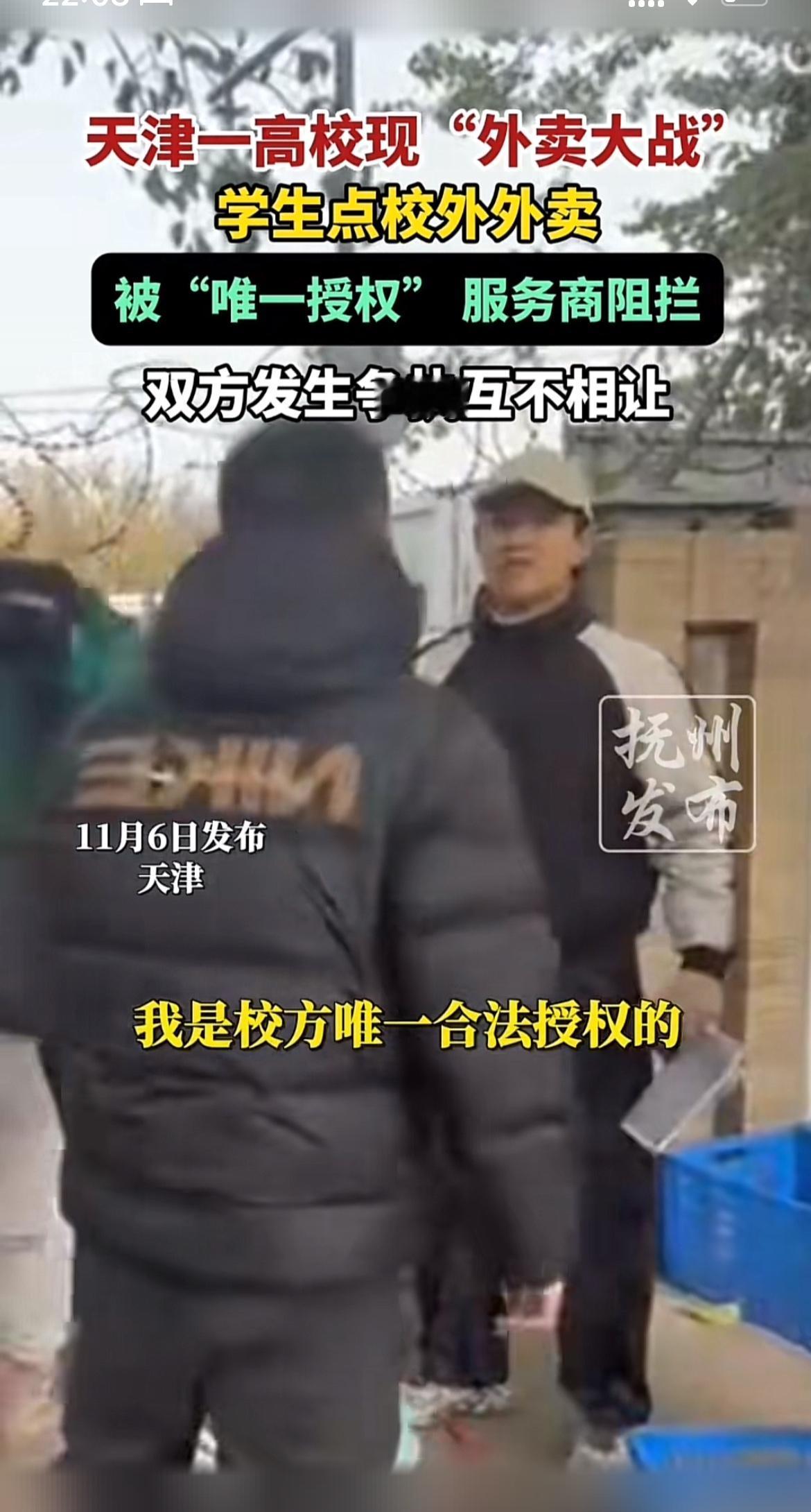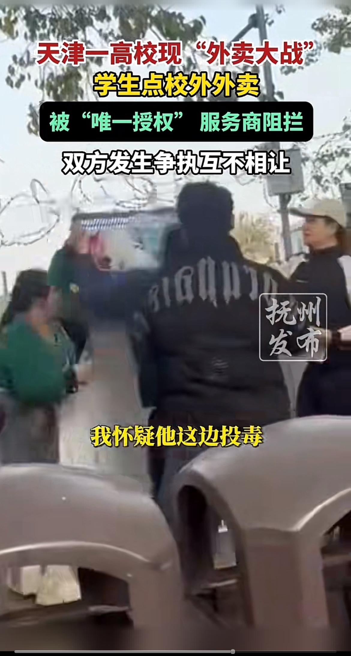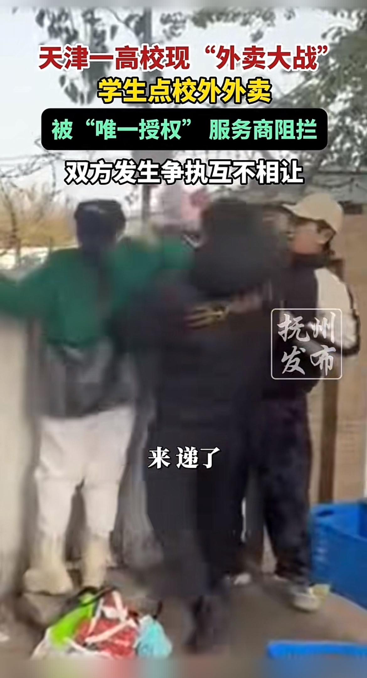 11月5日,天津工业大学一场外卖大战火了。学生点校外外卖,被校园“唯一指定”外卖阻挡,双方还起了争执,甚至有肢体冲突。校内外卖服务商竟称怀疑对方投毒,这理由也是够奇葩的。 原来是食力派外卖柜和校园送外卖员有矛盾。外卖柜存外卖要付费,校外配送员就从围墙传外卖,影响了外卖柜收入。记者联系相关方,学校工作人员都说不清楚情况。这事儿说白了就是商业竞争纠纷,“唯一指定”方的霸道行为,实在是无理取闹,学生点个外卖容易吗?