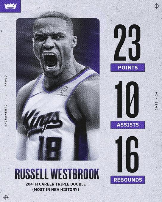 底薪无保障合同的威少,如今打出了全明星级别的表现,就这样国王也没有把合同变成全额保障。属实有点不尊重威斯布鲁克。今日NBA常规赛国王121-116战胜勇士。威少继续首发出战,全场13中9,三分4中3得到23分16篮板10助攻。生涯第18个赛季还能拿三双,威少是NBA历史首位做到的后卫。威斯布鲁克11月场均可以得到20.3分11.0篮板8.7助攻1.7抢断,投篮命中率52.3%,三分命中率40.0%,罚球命中率100.0%,真实命中率63.6%。从进入首发,威少好像重回巅峰了,休赛期差点无球可打,如今这表现看来还能再打两年,只要上场永远那么有激情,满满的正能量。