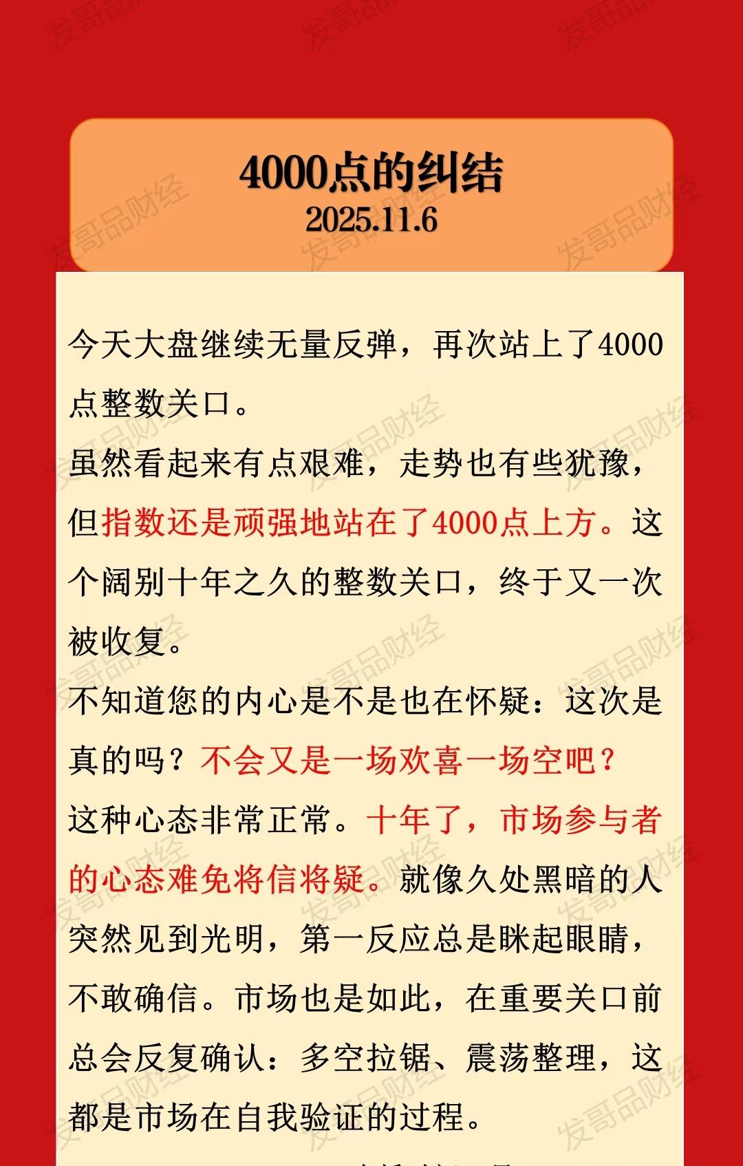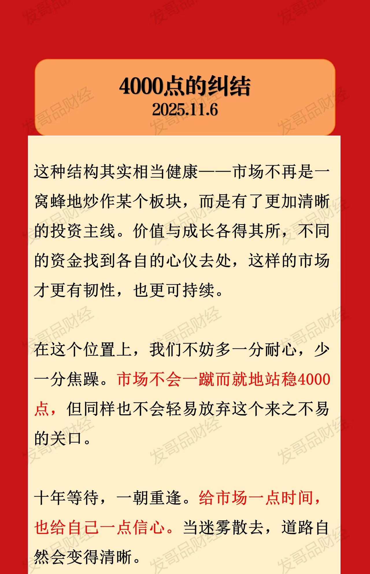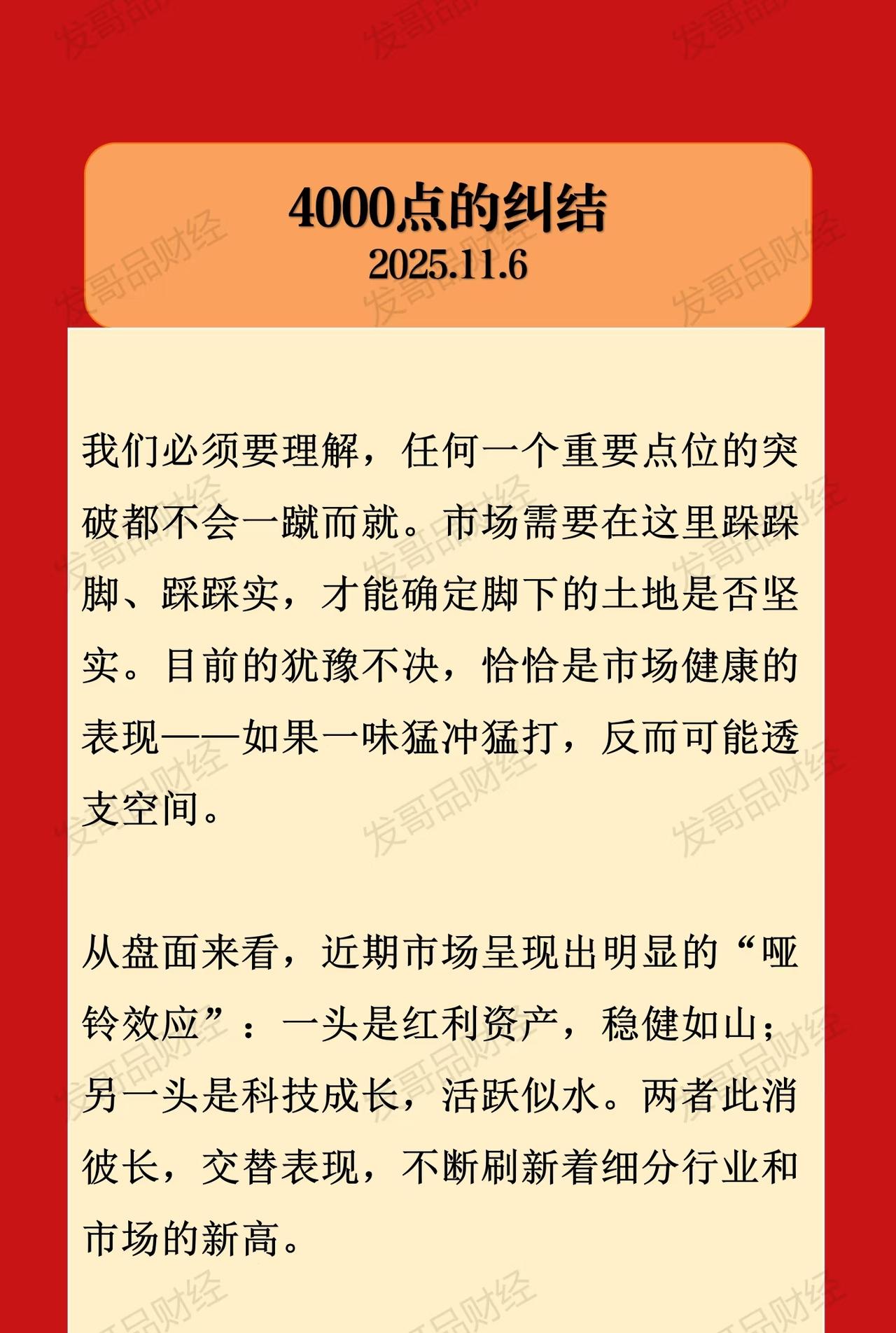 总结:2025年11月6日“4000点的纠结”财经分析 核心背景 - 大盘表现:2025年11月6日,A股大盘无量反弹,时隔十年再次站上4000点整数关口,但走势艰难且犹豫,市场多空博弈明显。 - 投资者心态:许多人对重回4000点将信将疑,类似“久处黑暗后突然见到光明”的谨慎反应,市场在重要关口通常会反复震荡、确认支撑。 市场特征分析 1. 突破不会一蹴而就 - 重要点位的站稳需要时间验证,当前市场的犹豫是健康表现,若强行突破反而可能透支上涨空间。 - 市场会在关键位置(如4000点)反复拉锯,通过震荡整理来确认趋势的稳固性。 2. “哑铃效应”明显 - 近期市场呈现两极分化但交替强势的格局: - 一端是红利资产(如高股息、蓝筹股):表现稳健,提供市场稳定性。 - 另一端是科技成长股(如AI、半导体等):活跃度高,推动局部创新高行情。 - 两大风格此消彼长,共同支撑市场热度,而非单一板块独涨。 3. 市场结构健康 - 当前行情不再是“一窝蜂炒作”,而是价值(红利)与成长(科技)并存,不同资金找到适合的方向,增强了市场的韧性和可持续性。 投资建议与展望 - 保持耐心:4000点得来不易,市场不会轻易放弃这一关口,但也需时间消化压力。 - 减少焦虑:投资者不必因短期波动过度担忧,给市场时间稳固,也给自己信心。 - 长期视角:十年后重返4000点,短期迷雾终将散去,清晰的趋势会在震荡后逐步显现。 总结观点 - 4000点是重要心理与技术关口,当前反复震荡属于正常现象,市场正在自我验证。 - “哑铃型”结构(红利+科技)是当前主线,资金分布合理,市场具备韧性。 - 投资者应保持耐心与信心,避免追涨杀跌,等待市场趋势进一步明朗。
