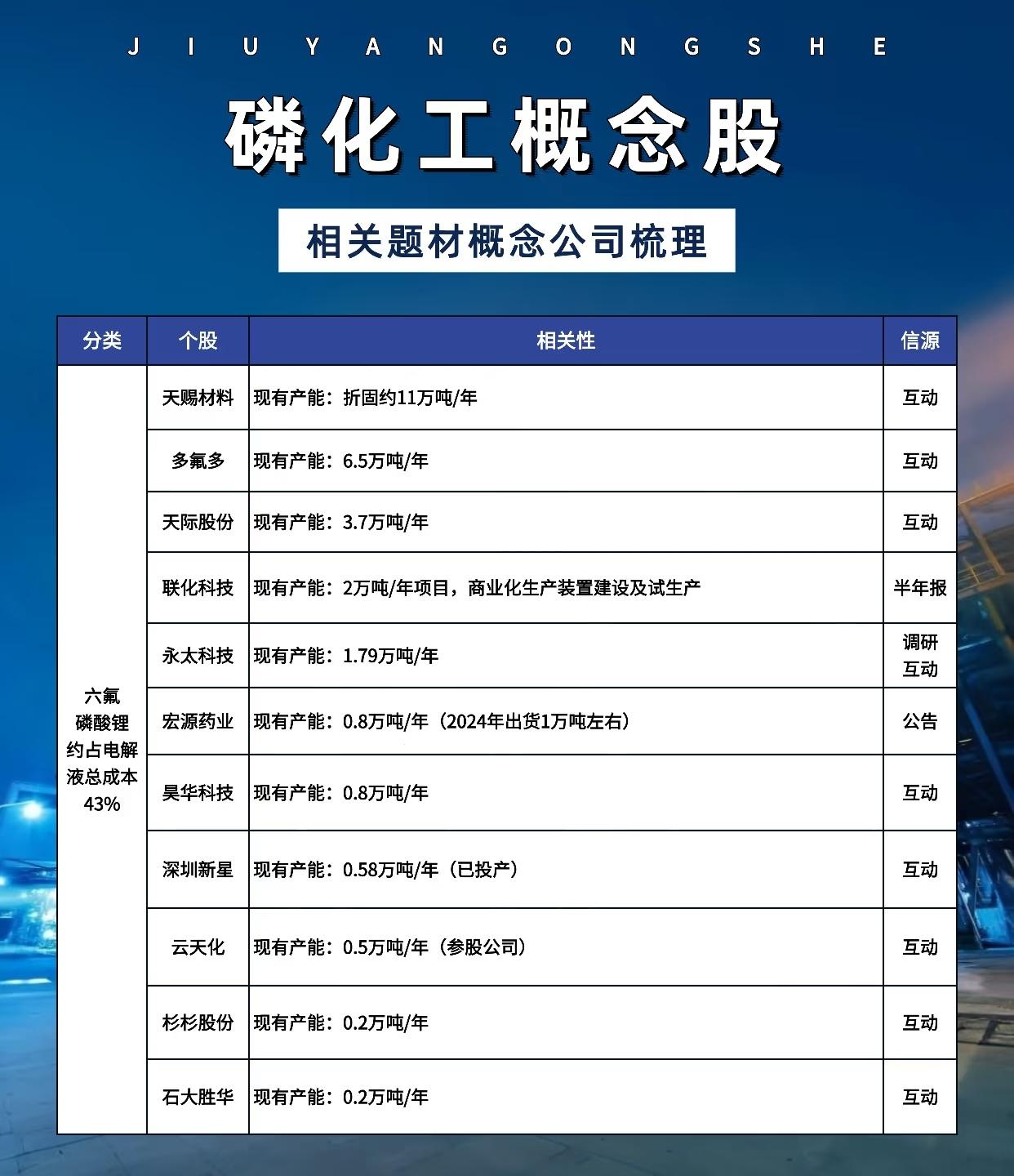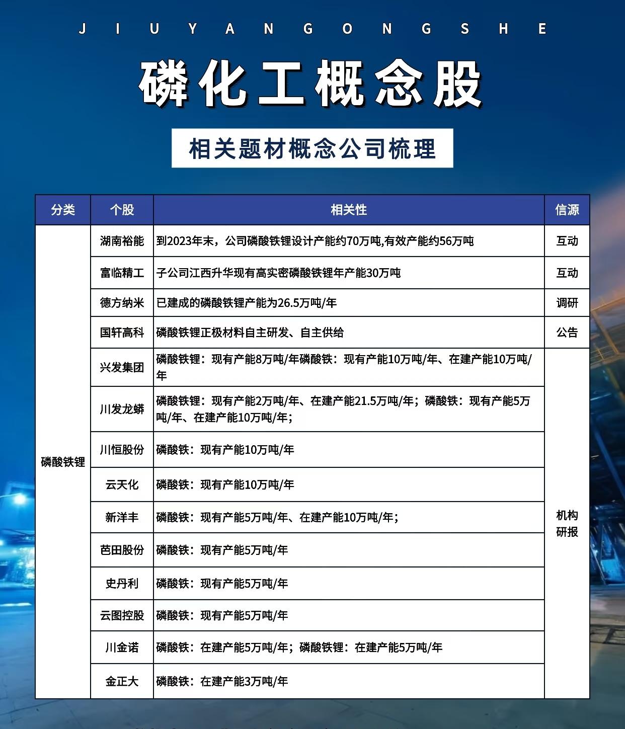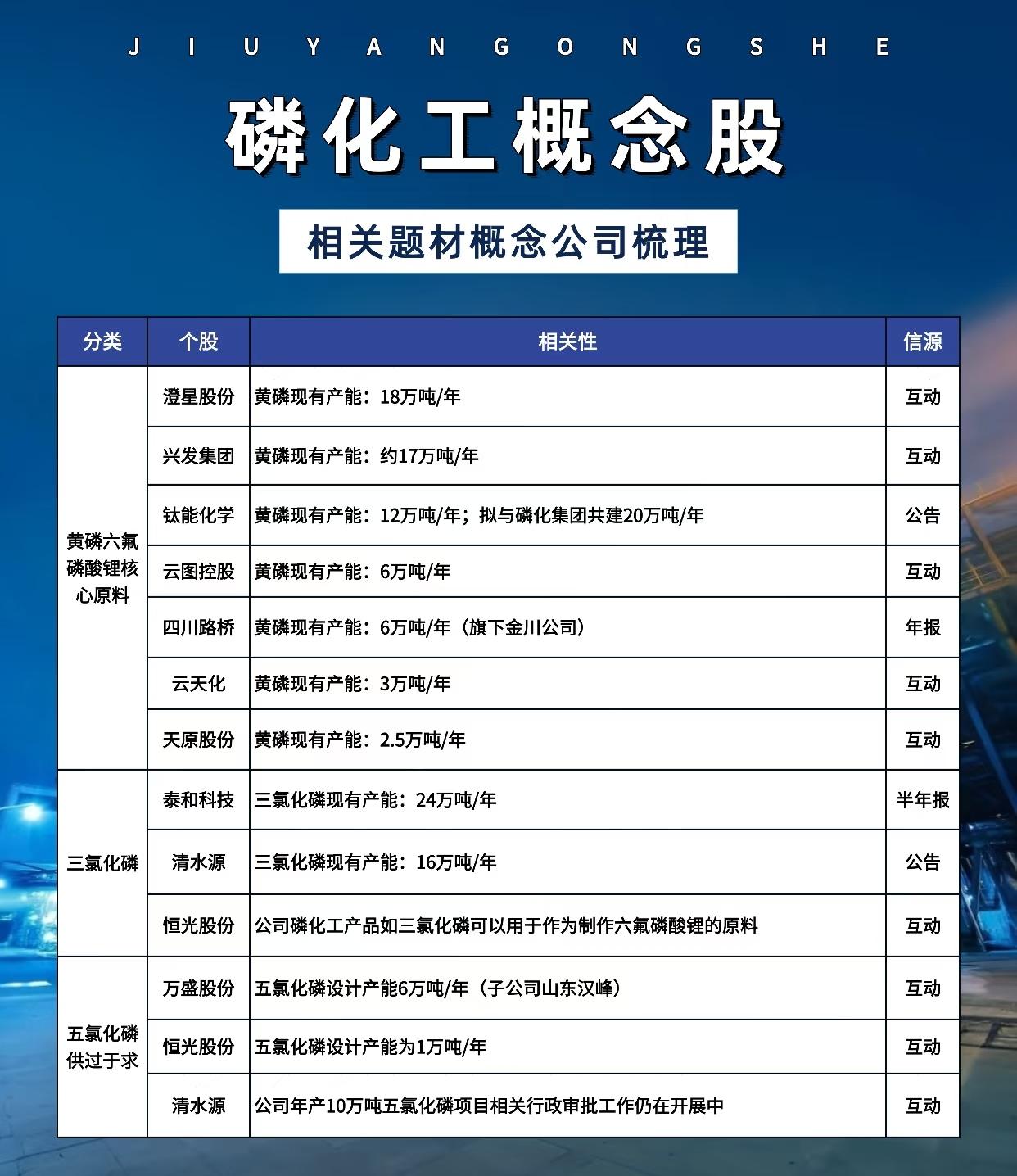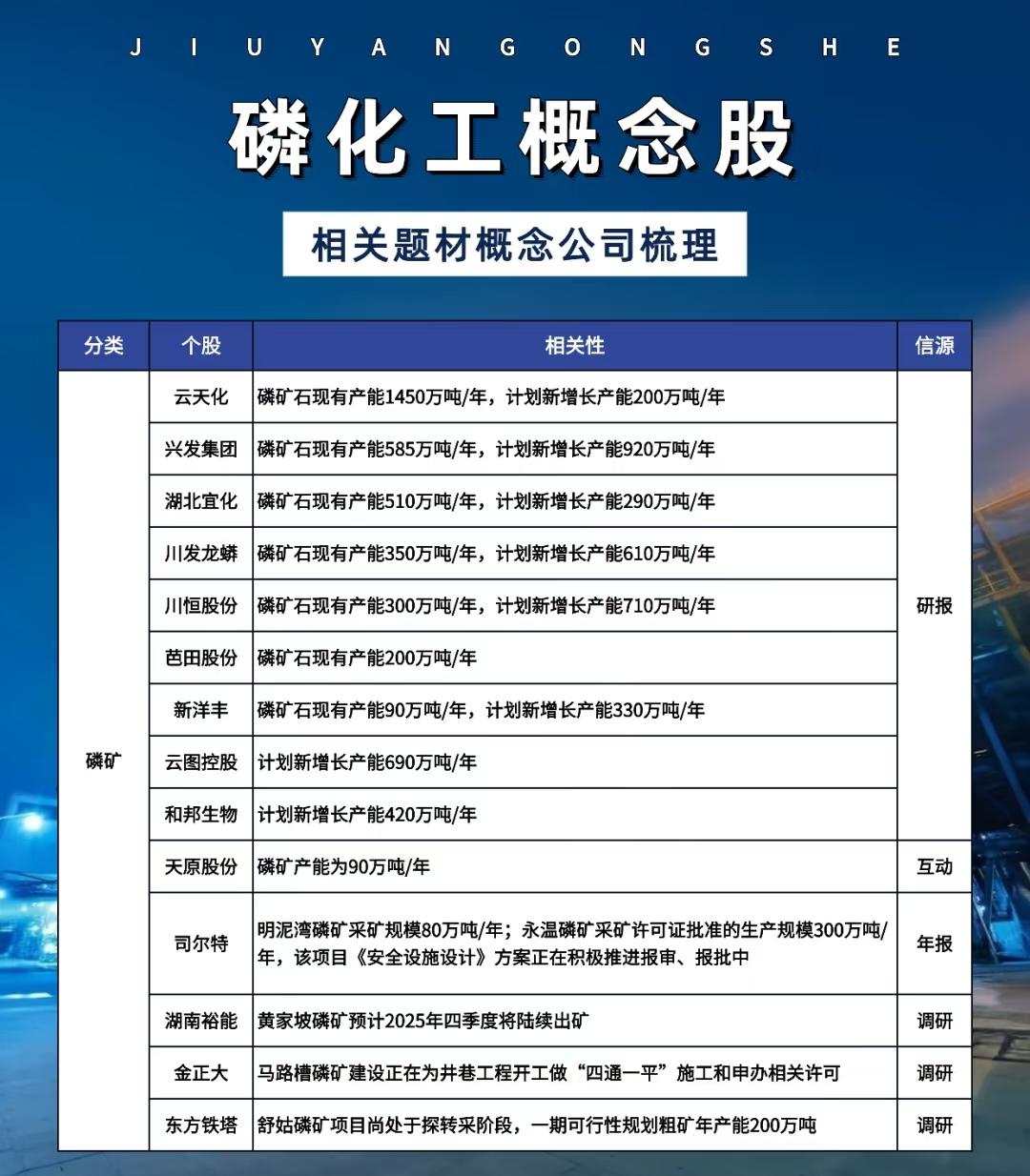 关于“磷化工概念股”的详细梳理,涵盖多个细分领域的主要上市公司及其产能、项目进展与信息来源,具体如下: 一、磷矿资源类企业(磷矿开采与产能) 主要公司包括: - 云天化:磷矿石现有产能1450万吨/年,计划新增200万吨/年。 - 兴发集团:现有产能585万吨/年,计划新增920万吨/年。 - 湖北宜化:现有产能510万吨/年,计划新增290万吨/年。 - 川发龙蟒:现有产能350万吨/年,计划新增610万吨/年。 - 川恒股份:现有产能300万吨/年,计划新增710万吨/年。 - 芭田股份:现有产能200万吨/年。 - 新洋丰:现有产能90万吨/年,计划新增330万吨/年。 - 云图控股:计划新增产能690万吨/年。 - 和邦生物:计划新增产能420万吨/年。 - 天原股份:现有产能90万吨/年(信息源自互动)。 - 司尔特:明泥湾磷矿采矿规模80万吨/年;永温磷矿拟建300万吨/年,安全设施设计正在报审(信息源自年报)。 - 湖南裕能:旗下黄家坡磷矿预计2025年四季度开始出矿。 - 金正大:马路槽磷矿正在进行“四通一平”及许可申办等前期工作(调研)。 - 东方铁塔:舒姑磷矿项目处于探转采阶段,一期规划粗矿产能200万吨/年(调研)。 信息来源主要为:研报、互动、年报、调研等。 二、黄磷及六氟磷酸锂核心原料类企业 主要公司及产能: - 澄星股份:黄磷现有产能18万吨/年(互动)。 - 兴发集团:黄磷现有产能约17万吨/年(互动)。 - 钛能化学:黄磷现有产能12万吨/年,拟与磷化集团共建20万吨/年(公告)。 - 云图控股:黄磷现有产能6万吨/年(互动)。 - 四川路桥(旗下金川公司):黄磷现有产能6万吨/年(年报)。 - 云天化:黄磷现有产能3万吨/年(互动)。 - 天原股份:黄磷现有产能2.5万吨/年(互动)。 其他关联原料: - 三氯化磷(用于六氟磷酸锂原料): - 泰和科技:现有产能24万吨/年(半年报)。 - 清水源:现有产能16万吨/年(公告)。 - 恒光股份:三氯化磷可用于六氟磷酸锂生产(互动)。 - 五氯化磷(当前供过于求): - 万盛股份(山东汉峰子公司):设计产能6万吨/年(互动)。 - 恒光股份:设计产能1万吨/年(互动)。 - 清水源:年产10万吨五氯化磷项目,行政审批仍在进行中(互动)。 三、六氟磷酸锂(电解液核心材料,占电解液成本约43%) 主要公司及产能: - 天赐材料:现有产能折固约11万吨/年(互动)。 - 多氟多:现有产能6.5万吨/年(互动)。 - 天际股份:现有产能3.7万吨/年(互动)。 - 联化科技:现有2万吨/年项目,商业化装置在建设中(半年报)。 - 永太科技:现有产能1.79万吨/年(调研互动)。 - 宏源药业:现有产能0.8万吨/年,2024年出货约1万吨(公告)。 - 昊华科技:现有产能0.8万吨/年(互动)。 - 深圳新星:现有产能0.58万吨/年(已投产)(互动)。 - 云天化(参股公司):现有产能0.5万吨/年(互动)。 - 杉杉股份:现有产能0.2万吨/年(互动)。 - 石大胜华:现有产能0.2万吨/年(互动)。 四、磷酸铁锂及磷酸铁(新能源电池正极材料) 主要公司及产能情况: - 湖南裕能:截至2023年末,磷酸铁锂设计产能约70万吨,有效产能约56万吨(互动)。 - 富临精工(子公司江西升华):现有高实密磷酸铁锂年产能30万吨(互动)。 - 德方纳米:已建成磷酸铁锂产能26.5万吨/年(调研)。 - 国轩高科:磷酸铁锂正极材料自主生产(公告)。 - 兴发集团:磷酸铁锂现有产能8万吨/年;磷酸铁现有产能10万吨/年,在建10万吨/年(机构研报)。 - 川发龙蟒:磷酸铁锂现有产能2万吨/年,在建21.5万吨/年;磷酸铁现有产能5万吨/年,在建10万吨/年(机构研报)。 - 川恒股份:磷酸铁现有产能10万吨/年(机构研报)。 - 云天化:磷酸铁现有产能10万吨/年(机构研报)。 - 新洋丰:磷酸铁现有产能5万吨/年,在建10万吨/年(机构研报)。 - 芭田股份:磷酸铁现有产能5万吨/年(机构研报)。 - 史丹利:磷酸铁现有产能5万吨/年(机构研报)。 - 云图控股:磷酸铁现有产能5万吨/年(机构研报)。 - 川金诺:磷酸铁在建5万吨/年,磷酸铁锂在建5万吨/年(机构研报)。 - 金正大:磷酸铁在建产能3万吨/年(机构研报)。