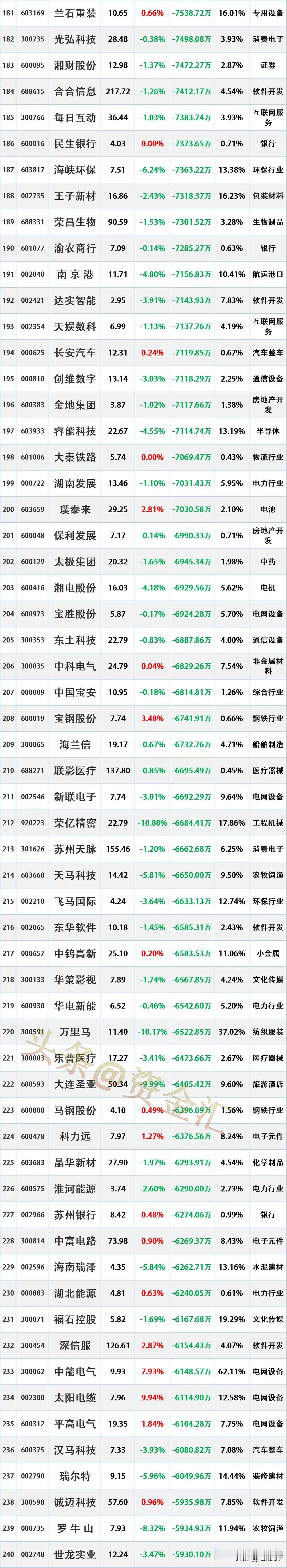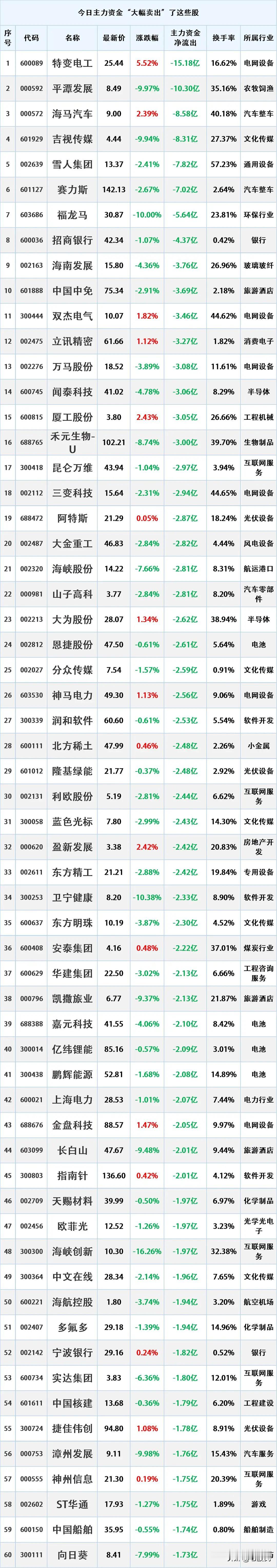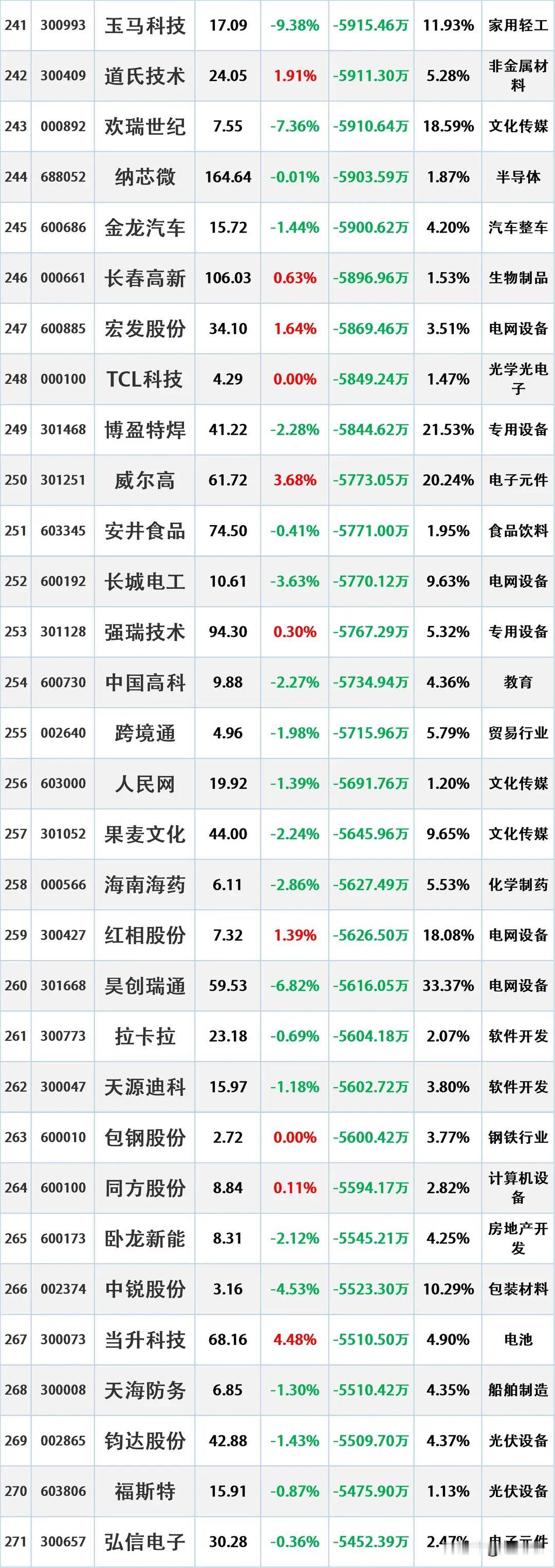 资金出逃,11月6日主力资金大幅流出的股票名单。 资金流出是指在一定时期内(如一天、一周等),主动卖出某只股票的资金量大于主动买入该股票的资金量。主动卖出是指投资者以买方的报价直接成交,显示出投资者对该股票的消极持有或抛售意愿。
