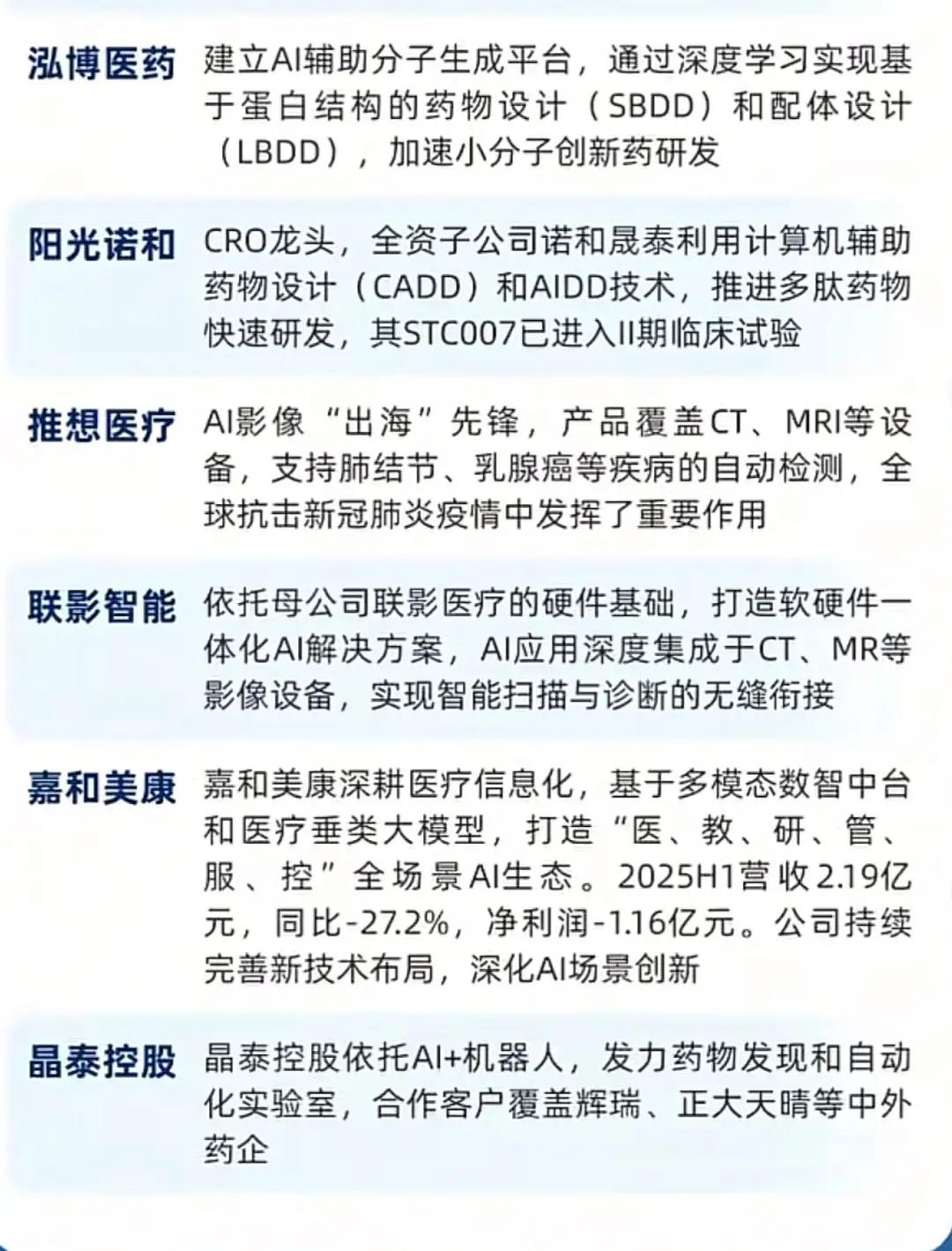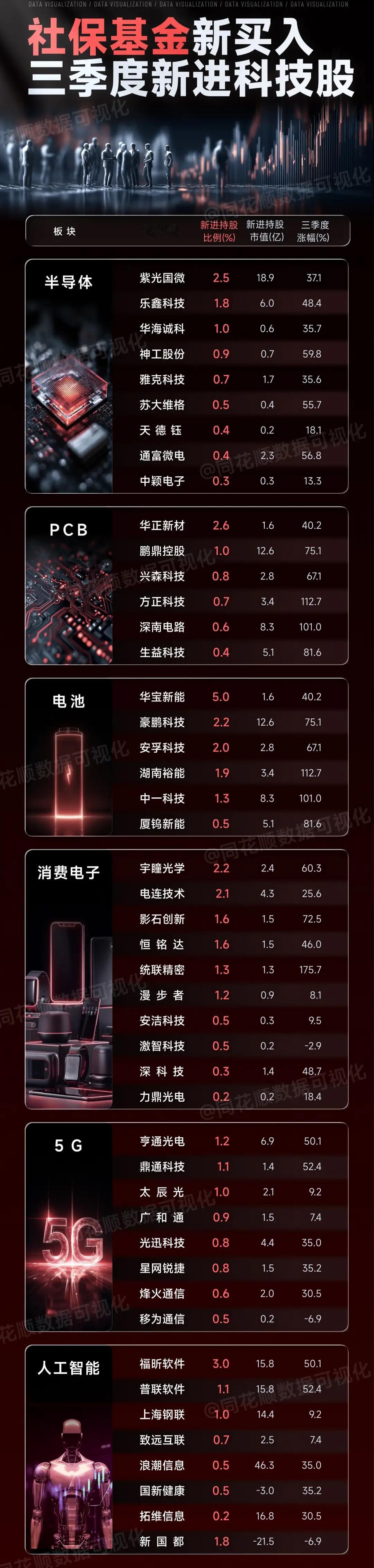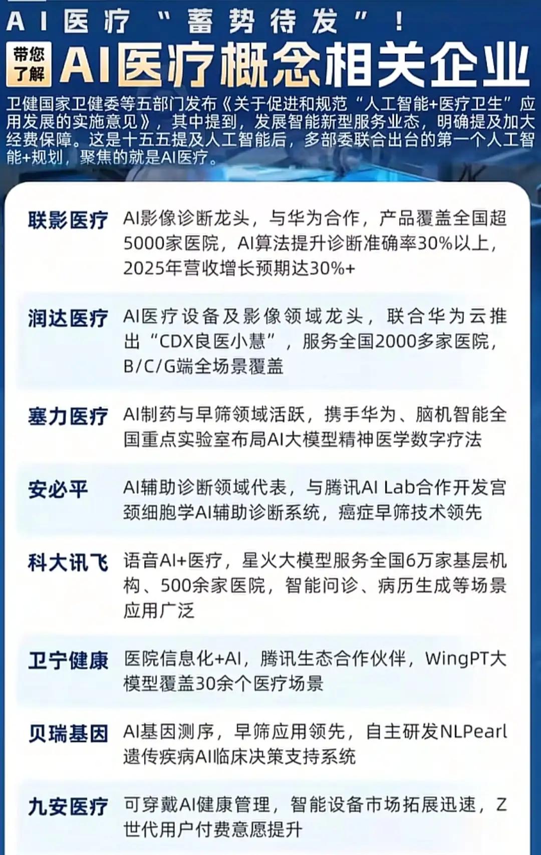 一、社保基金三季度新进科技股布局 社保基金在2024年三季度新买入了多个科技细分领域的股票,主要包括以下六大板块: 1. 半导体 - 重点股票:紫光国微(新进持股2.5%,市值18.9亿,三季度涨幅37.1%)、乐鑫科技(1.8%,6.0亿,48.4%)、神工股份(0.9%,0.7亿,59.8%)、雅克科技(0.7%,1.7亿,35.6%)等。 - 多只个股三季度涨幅超35%,显示社保对半导体板块高度关注。 2. PCB(印制电路板) - 重点股票:方正科技(0.7%,3.4亿,涨幅高达112.7%)、鹏鼎控股(1.0%,12.6亿,75.1%)、深南电路(0.6%,8.3亿,101.0%)、生益科技(0.4%,5.1亿,81.6%)。 - 方正科技、深南电路、生益科技等涨幅翻倍或接近翻倍。 3. 电池 - 重点股票:湖南裕能(1.9%,3.4亿,112.7%)、中一科技(1.3%,8.3亿,101.0%)、厦钨新能(0.5%,5.1亿,81.6%)。 - 电池板块多只个股涨幅超80%,湖南裕能与中一科技涨幅翻倍。 4. 消费电子 - 重点股票:统联精密(1.3%,1.3亿,涨幅高达175.7%)、影石创新(1.6%,1.5亿,72.5%)、恒铭达(1.6%,1.5亿,46.0%)。 - 统联精密涨幅最为突出,超过175%。 5. 5G - 重点股票:亨通光电(1.2%,6.9亿,50.1%)、鼎通科技(1.1%,1.4亿,52.4%)、光迅科技(0.8%,4.4亿,35.0%)。 - 整体表现稳健,多只个股涨幅超35%。 6. 人工智能 - 重点股票:福昕软件(3.0%,15.8亿,50.1%)、普联软件(1.1%,15.8亿,52.4%)、浪潮信息(0.5%,46.3亿,35.0%)。 - AI板块中,福昕软件与普联软件持股市值较大且涨幅明显。 二、燃气轮机概念股梳理 全球燃气轮机需求激增,相关产业链分为三大环节: 1. 零部件供应商 - 重点公司:应流股份(年内涨幅197.6%,高温叶片龙头)、豪迈科技(315.2%,高温合金涡轮叶片)、赛恩斯(106.1%)、迪威尔(120.0%)等。 - 多家公司为国内外大厂供应核心高温部件,年内涨幅惊人。 2. 整机及集成商 - 重点公司:东方电气(46.3%,重型燃气轮机国产替代有进展)、杰瑞股份(46.3%)、潍柴动力(37.9%,计划2025年发布新一代燃气发动机)。 - 东方电气在国产替代方面取得一定突破。 3. 材料及配套环节 - 重点公司:航亚科技(48.9%,覆盖燃气轮机零件)、鹰普精密(194.5%,产品用于燃烧室)、万泽股份(61.2%,高温合金材料)。 - 航亚科技与鹰普精密在核心零部件和材料领域具备优势。 三、存储芯片涨价潮 & 概念股表现 受闪迪、美光等国际巨头涨价消息刺激,9月19日存储芯片板块整体走强,德明利涨停,江波龙大涨超10%。 主要细分板块及代表公司: - 存储芯片设计:兆易创新、普冉股份、东芯股份、北京君正等。 - 存储模组:江波龙、朗科科技、德明利、佰维存储等。 - 存储封测及HBM:长电科技、华天科技、深科技、JCET等。 - 存储接口/代理/分销:澜起科技、香农芯创、聚辰股份。 - 设备/零件供应:北方华创、中微公司、拓荆科技、华海清科等。 整体呈现“设计—制造—封测—分销—设备”全产业链覆盖。 四、AI医疗概念企业梳理 在国家五部门发布《关于促进和规范“人工智能+医疗卫生”应用发展的实施意见》背景下,AI医疗成为热门赛道,相关企业包括: 核心企业及其亮点: 1. 联影医疗:AI影像诊断龙头,与华为合作,AI提升诊断准确率超30%,2025年营收预期增长30%。 2. 润达医疗:AI医疗设备及影像领域领先,推出“CDX良医小慧”,服务2000多家医院。 3. 塞力医疗:专注AI制药与早筛,与脑机实验室等合作精神医学数字疗法。 4. 安必平:AI辅助诊断代表,与腾讯AI Lab合作开发宫颈细胞学AI系统。 5. 科大讯飞:语音AI+医疗,服务6万家基层机构,智能问诊应用广泛。 6. 卫宁健康:医院信息化+AI,WingPT大模型覆盖30多个医疗场景。 7. 贝瑞基因:AI基因测序领先,自研遗传疾病AI决策系统。 8. 九安医疗:发力可穿戴AI健康管理,Z世代用户付费意愿高。