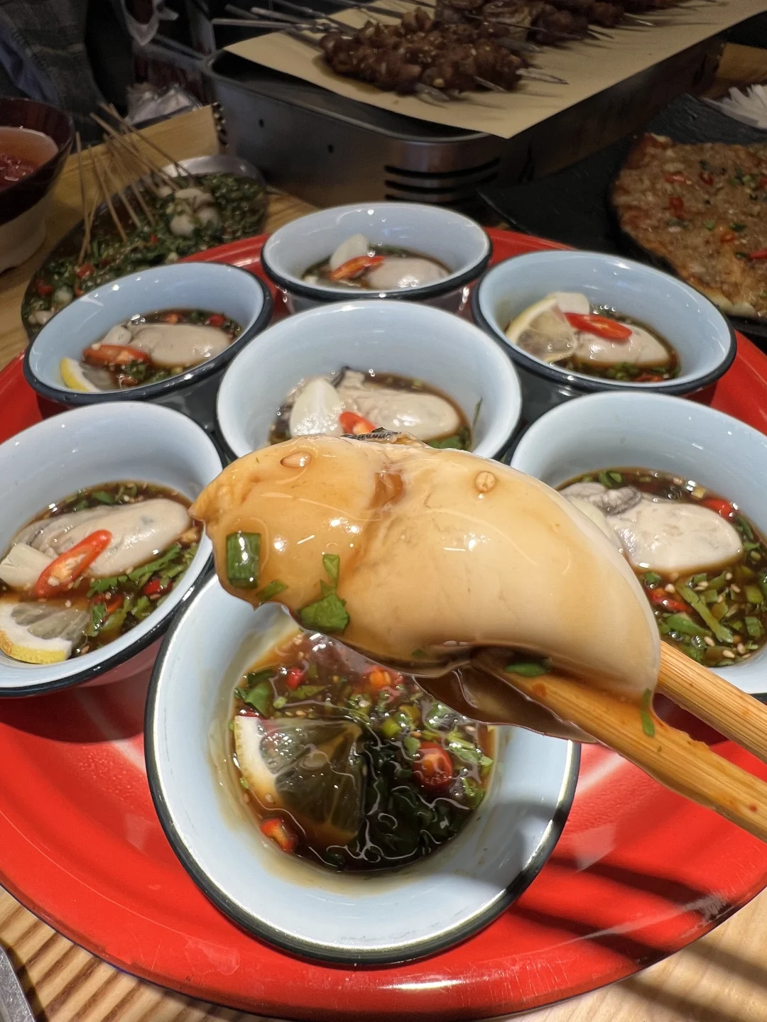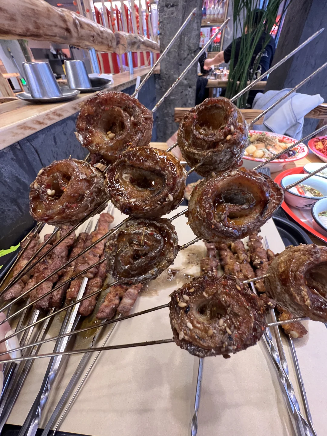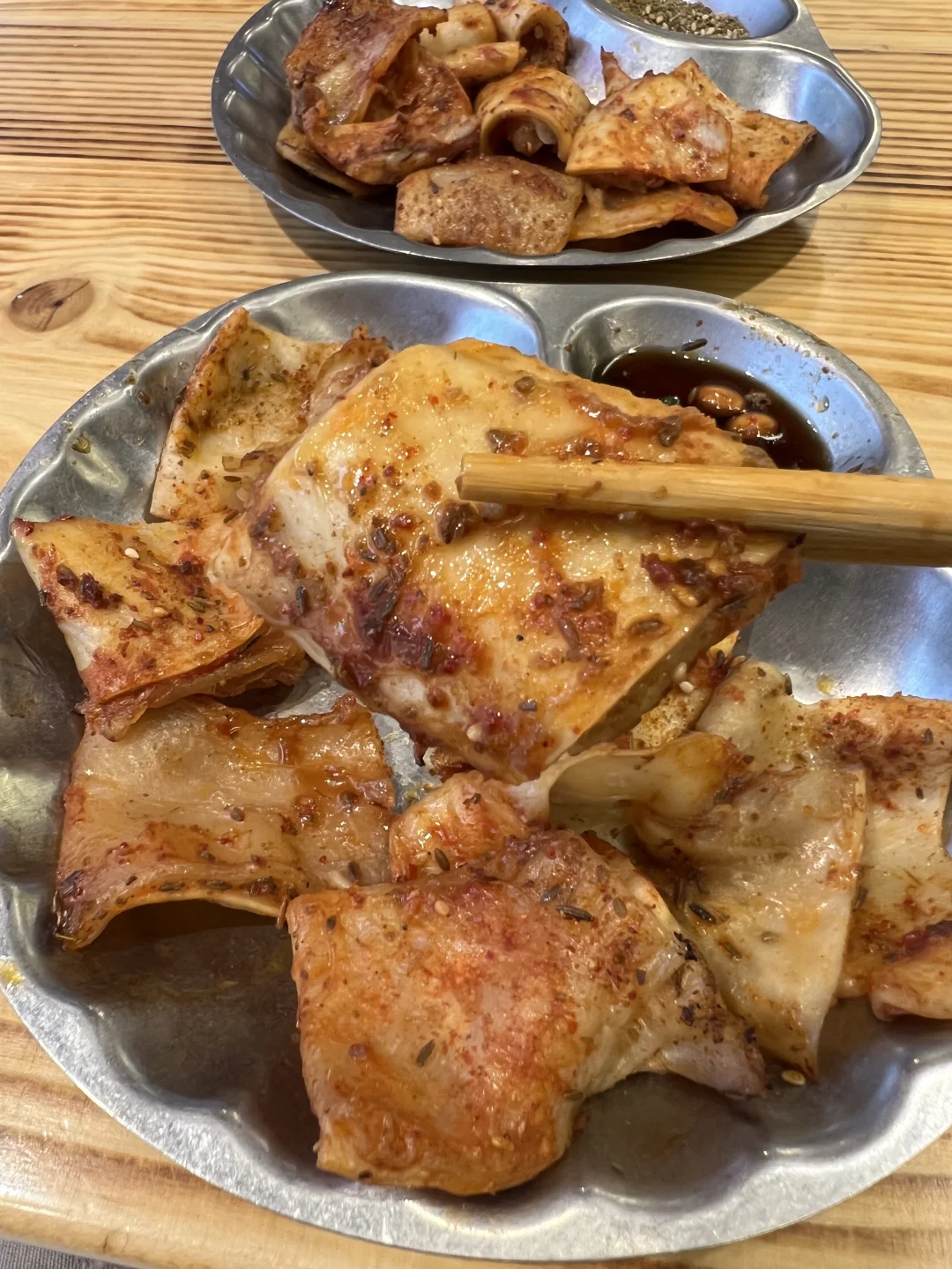 号称沈阳zui牛逼的大筋皮真的没失望!!! 超大个!!烀的jujuju软烂!!! 蘸汤豆皮、炸开花肠、羊肉小串薄饼、辣子鱿鱼都好好吃啊😭😭😭太香了!!!