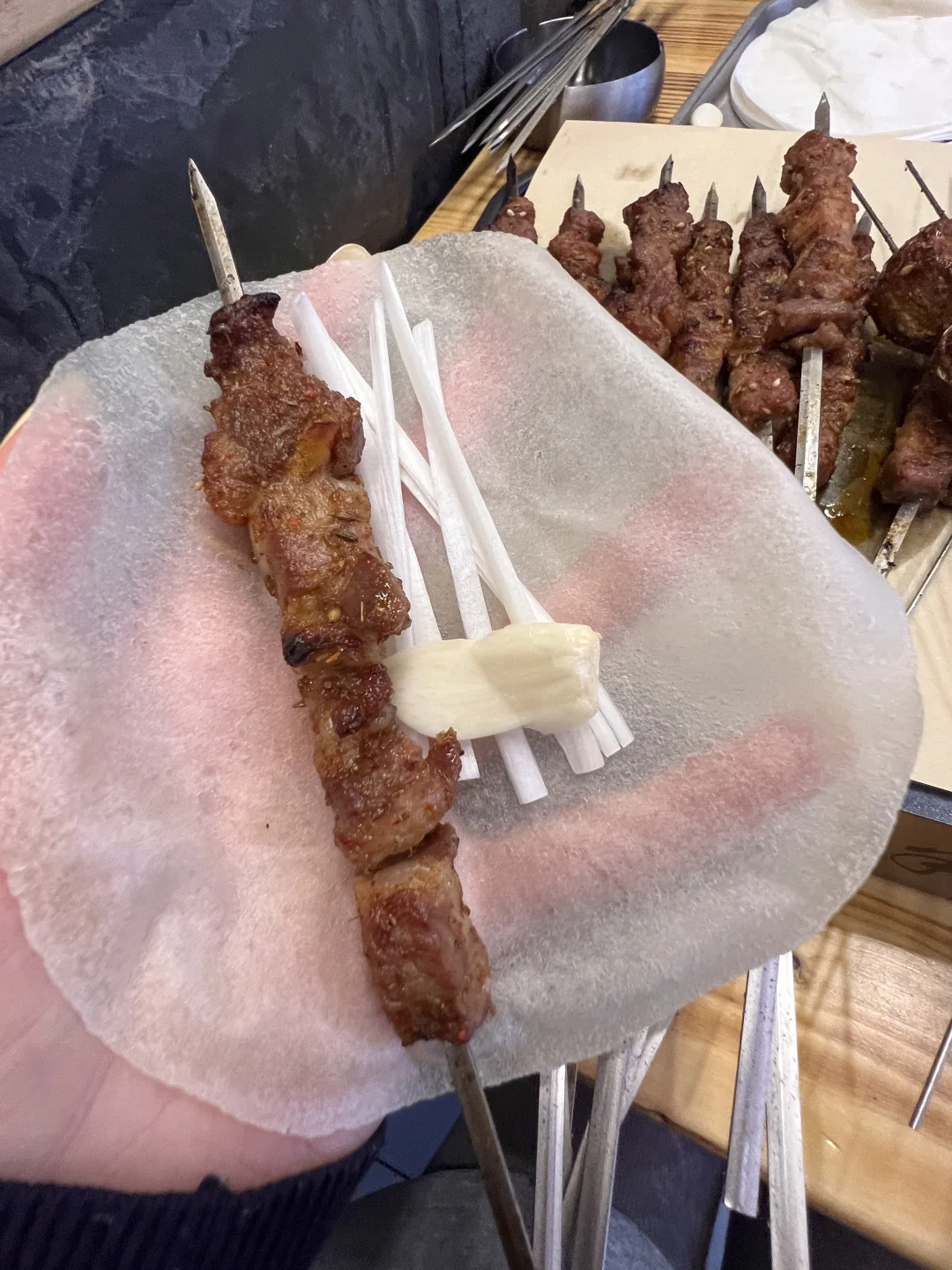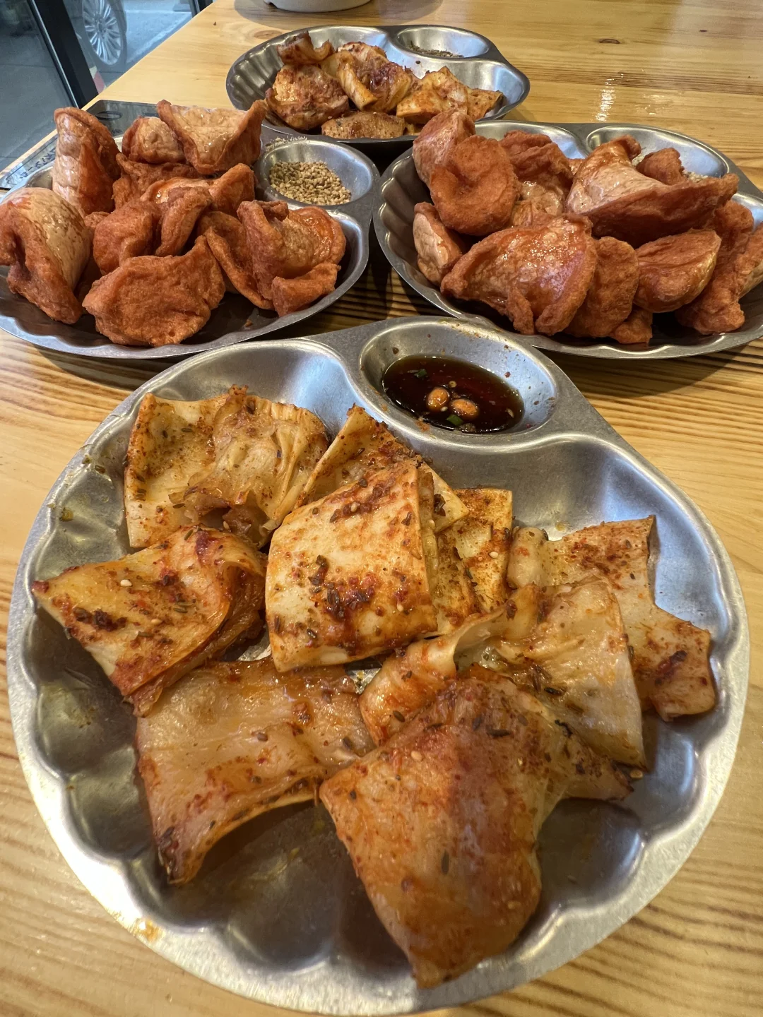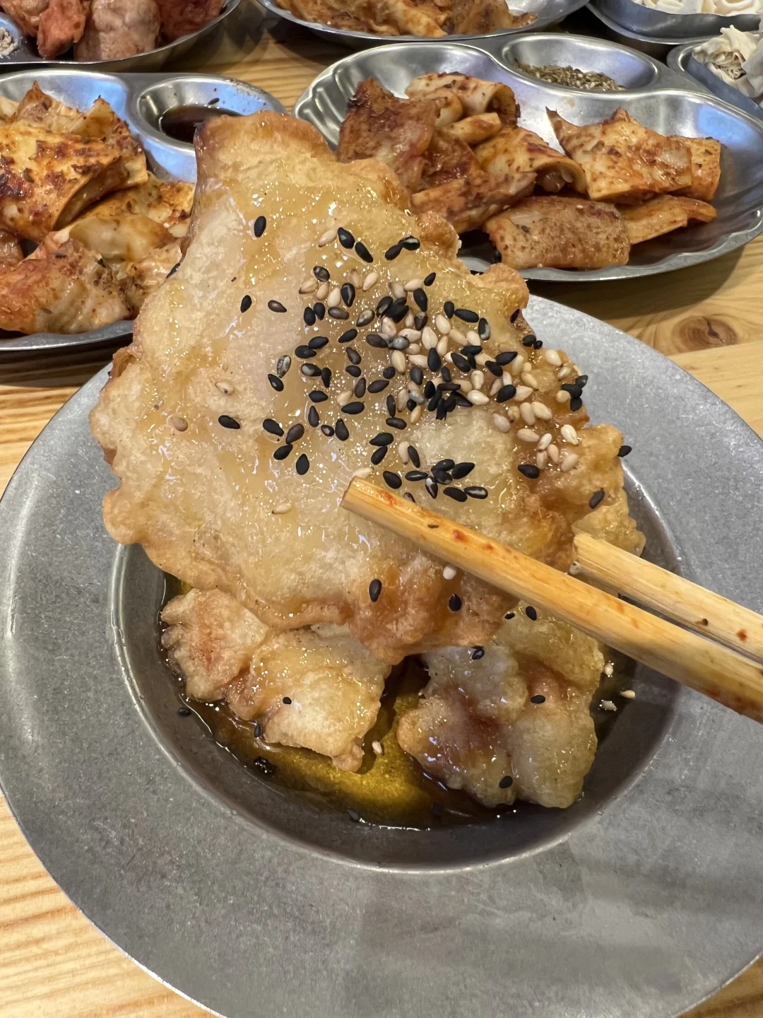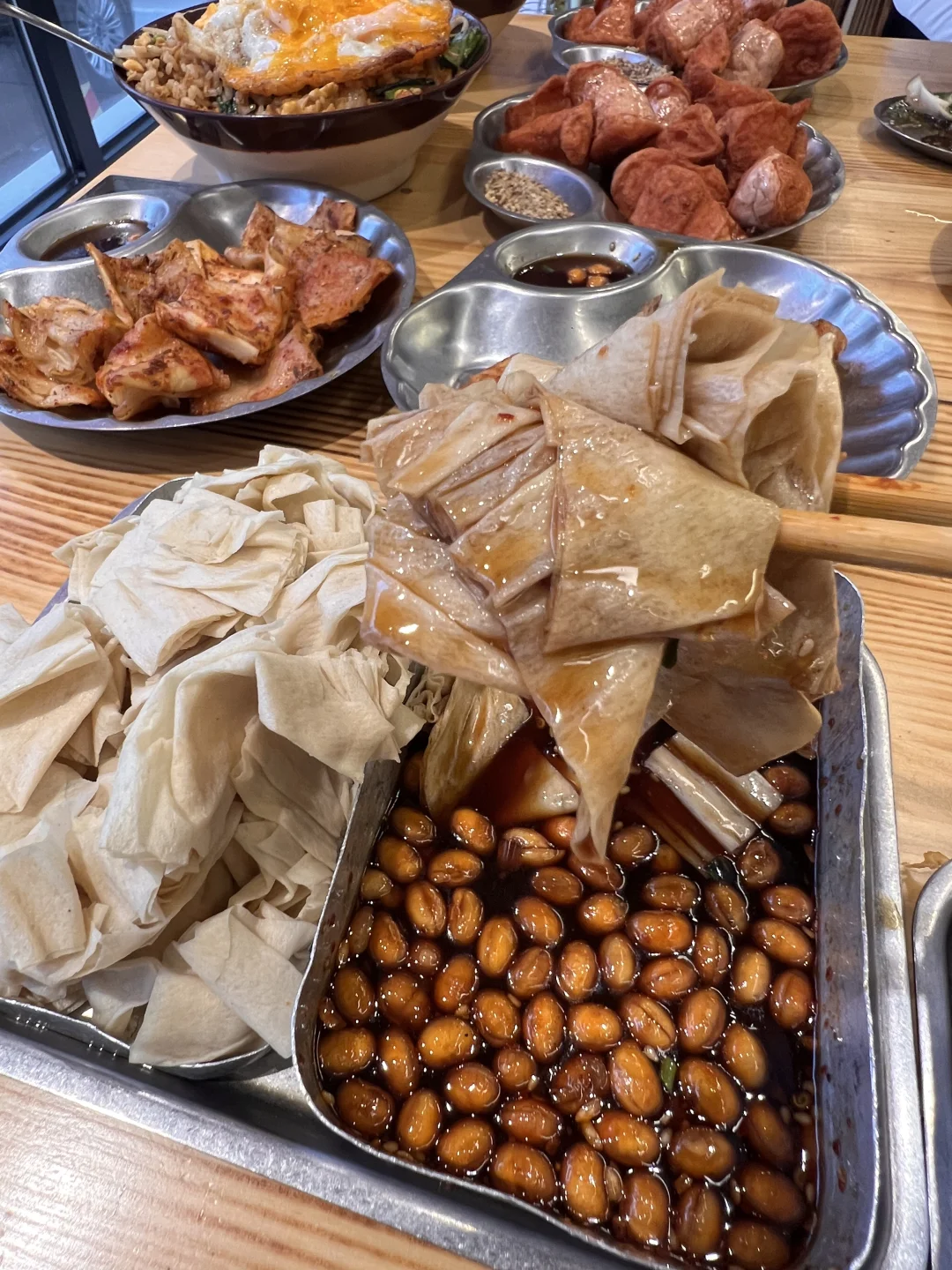 号称沈阳zui牛逼的大筋皮真的没失望!!! 超大个!!烀的jujuju软烂!!! 蘸汤豆皮、炸开花肠、羊肉小串薄饼、辣子鱿鱼都好好吃啊😭😭😭太香了!!!