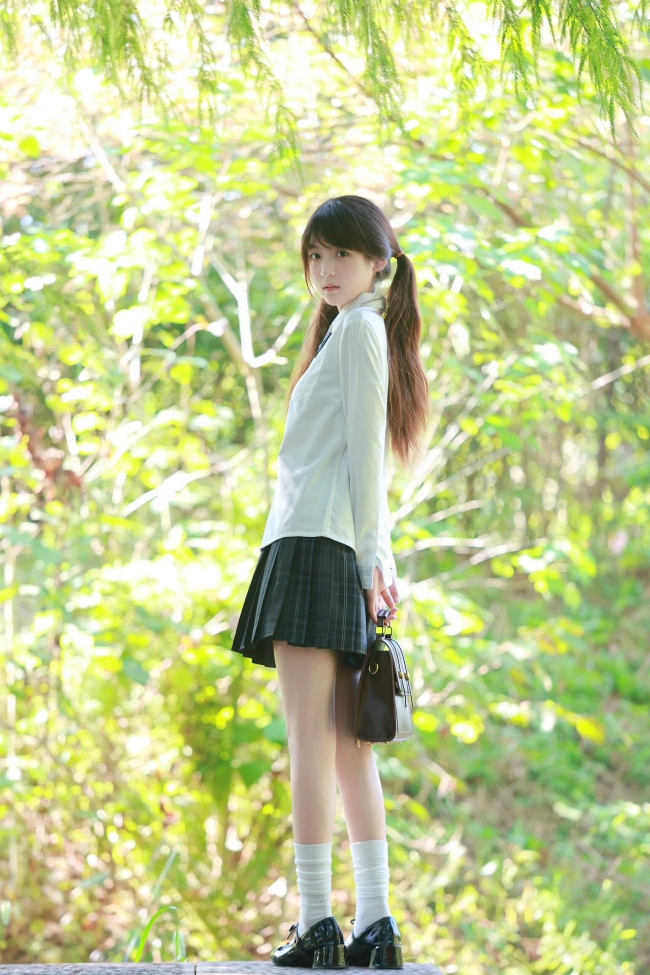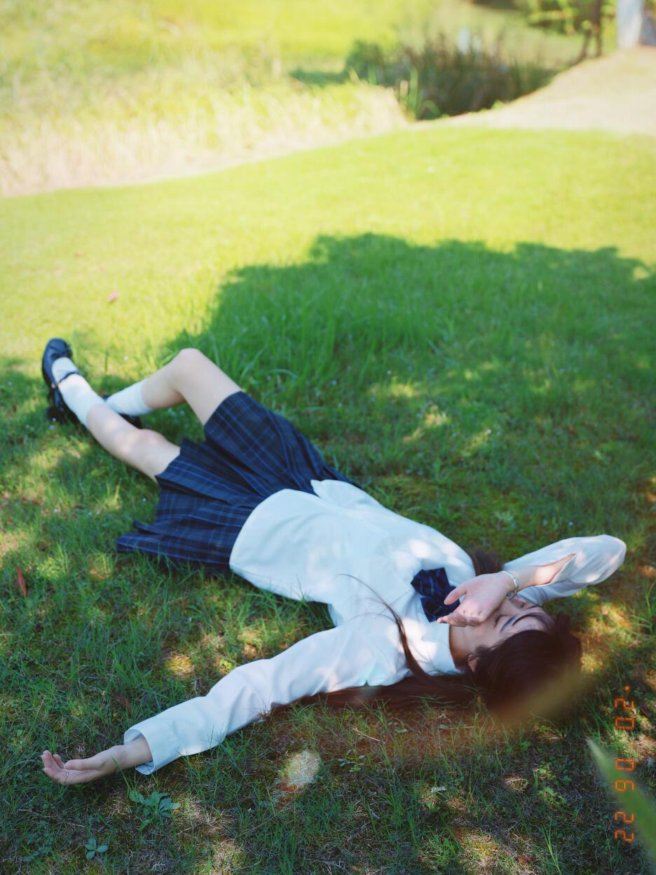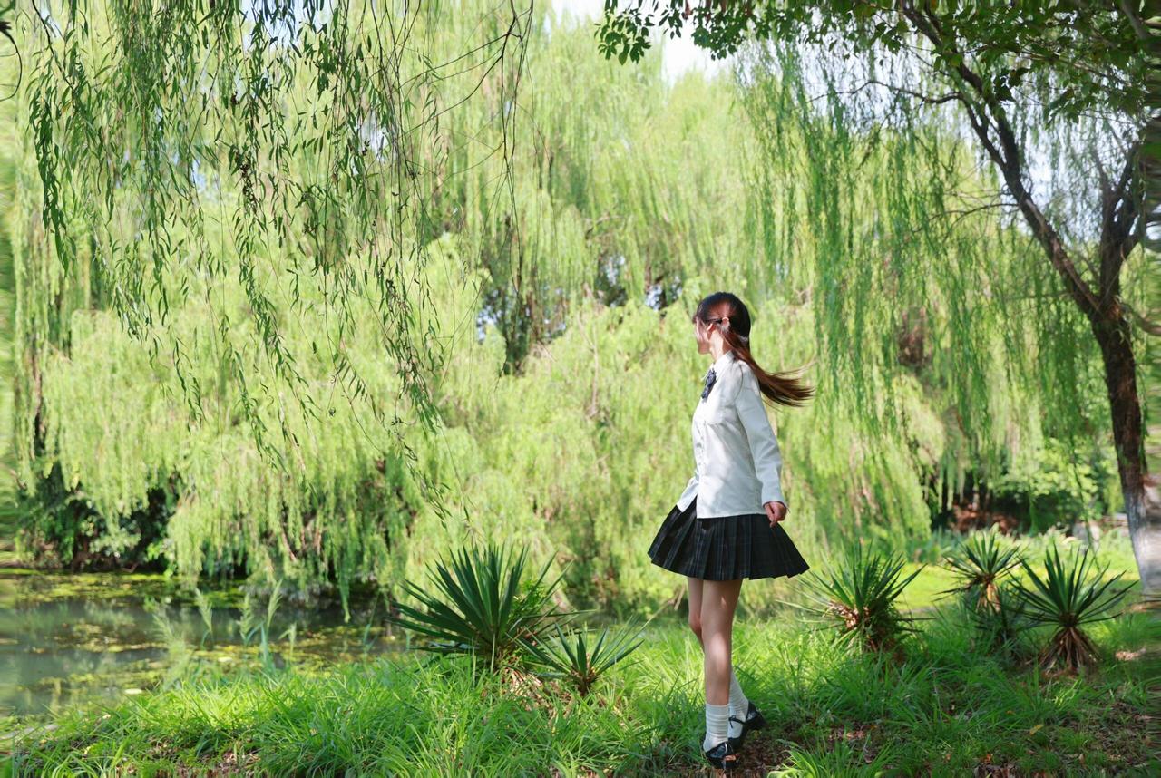 少女和郊外,不是“人站在景里”的割裂关系,而是互相成全——少女的青春气让自然更鲜活,自然的野趣让少女更生动。 比如柳树下的那张,少女转身时头发被风吹起来,和飘着的柳枝几乎融为一体,像是“风把少女和柳树绑在了一起”;趴在草地上的图,校服的蓝白和草地的绿撞在一起,不突兀反而很舒服,像是“少女本来就是自然里长出来的”。 连细节都在呼应这种共生感:白衬衫上的褶皱,和草地上的杂草纹理很像;百褶裙的线条,和柳树的枝条曲线差不多;甚至少女发呆的眼神,都和远处模糊的绿意一样“软乎乎”。 这种共生感让照片没了“摆拍的匠气”,反而像“少女本来就在这儿,镜头只是刚好路过”——自然没被当成“背景板”,少女也没被当成“道具”,两者都在画面里舒展着,把“青春就是和世界好好相处”的感觉拍透了。