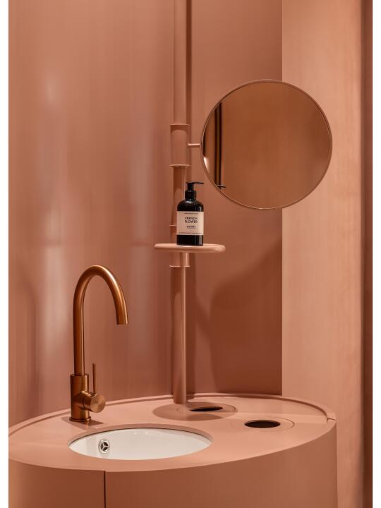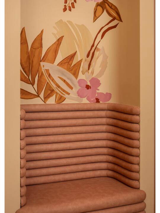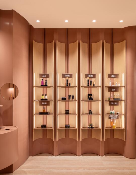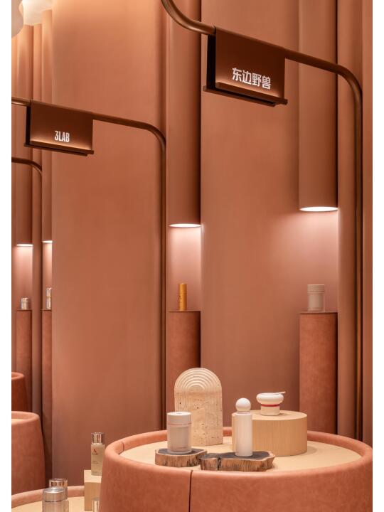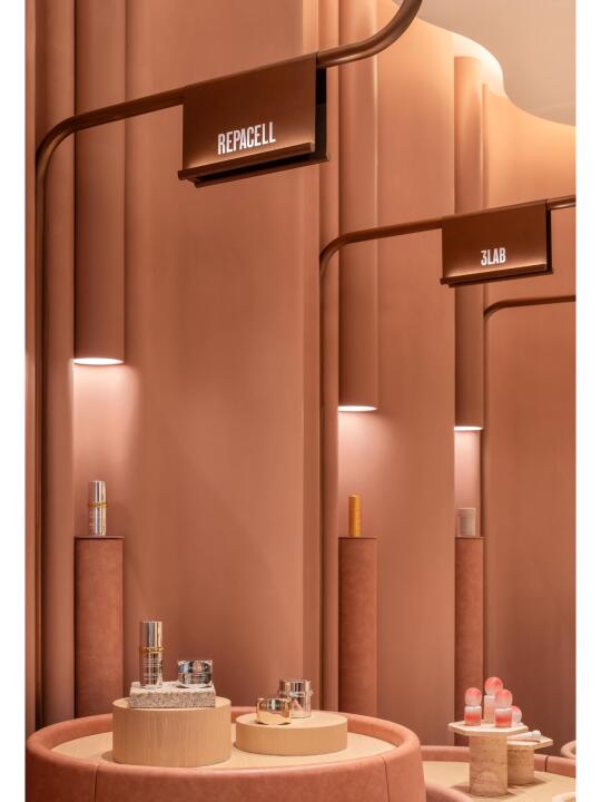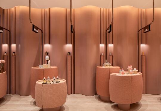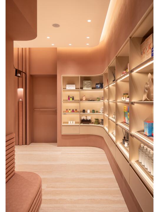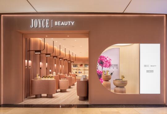 Joyce Beauty 上海兴业太古汇店,以夕阳下沙丘的柔和曲线与色彩为灵感,采用单色调设计,衬托出每个品牌的独特魅力。柔和感是本项目的核心,贯穿于布局、形态与材料选择。