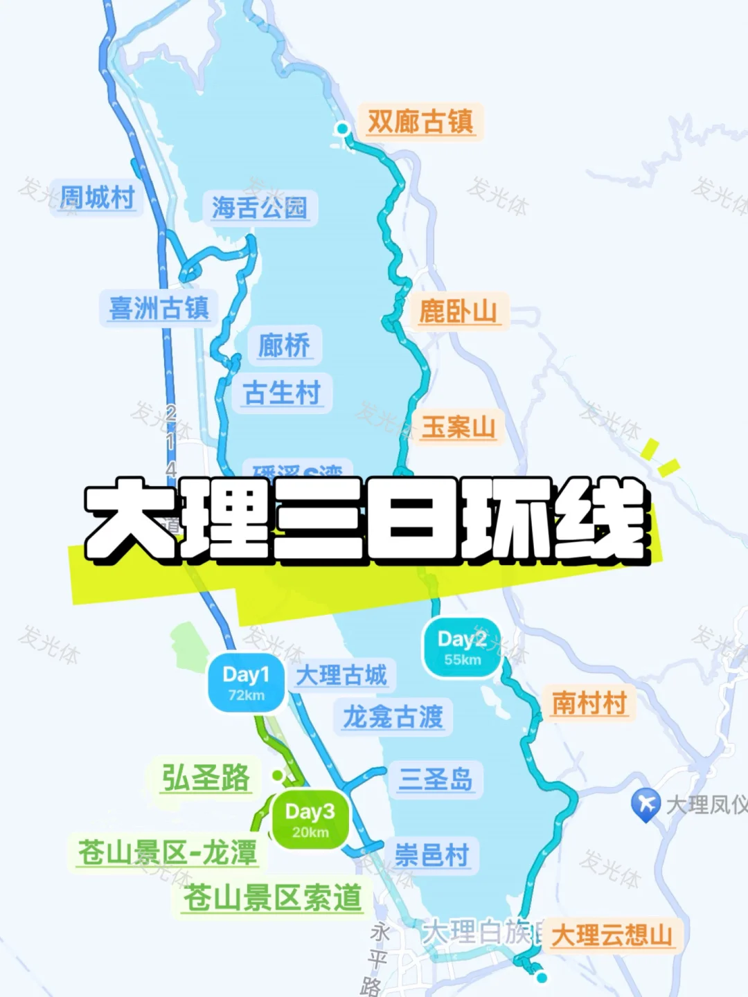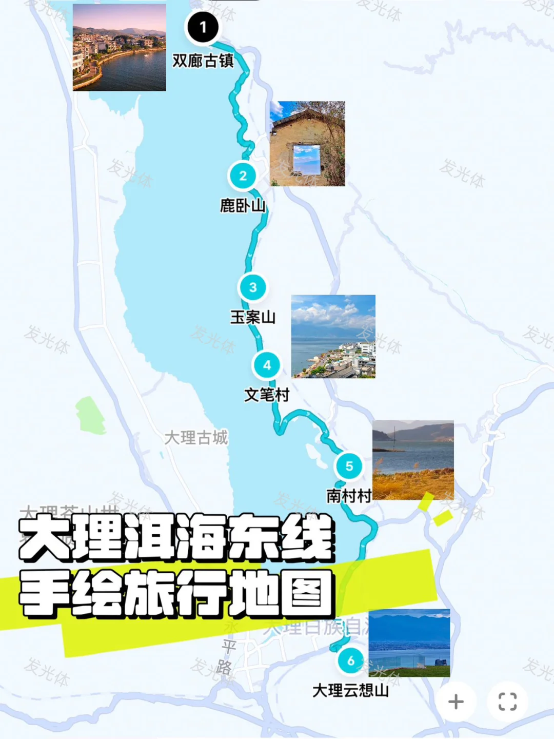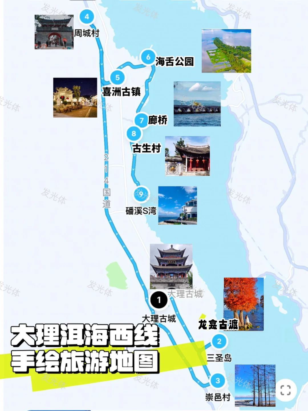 大理古城➡️龙龛古渡➡️三圣岛➡️崇邑村➡️周城村➡️喜洲古镇➡️海舌公园➡️廊桥➡️古生村➡️磻溪S湾