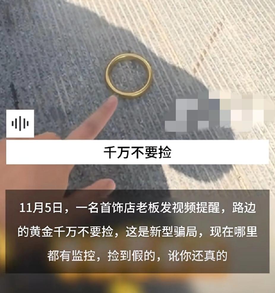 新型骗局!11月5日,一首饰店老板发视频提醒大家:“如果看到路边的金手镯,一定不要捡!”这位老板娘分享,近日南方出现了一种新型的骗局,骗子会将假的金手镯丢在有监控的地方,等你来捡! 你一旦将手镯捡走,对方就会拿着发票和监控来找你索要手镯,虽然你捡到的是假的金手镯,但你却需要还给骗子一个真的黄金手镯。一不小心就容易倾家荡产,请大家提高警惕!新型骗局来了,来看看自己有没有中招 警惕