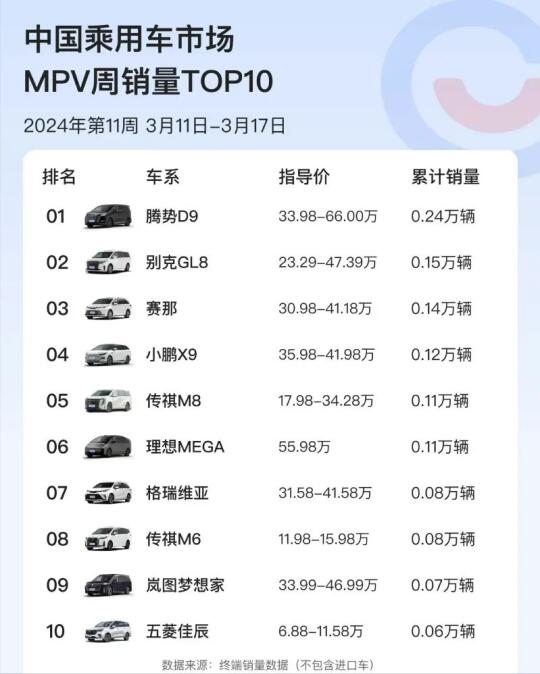 排名第一的是腾势D9,一周卖出了0.24万辆,这款车在近期刚刚完成了改款,2024款车型上市,降价一万元,排名第二的是别克GL8,MPV市场的常青树,上周卖出了0.15万辆。