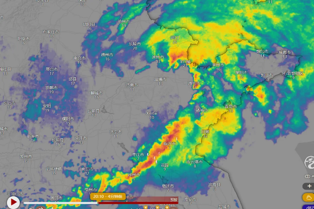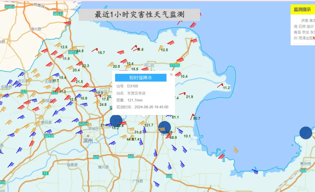 此外,东营利津虎滩站降水量为275.3毫米,滨州沾化区下河站降水量为264.7毫米。在刚刚过去的一个小时(19-20时)东营辛店1小时降水量达到140.5毫米,这个降水强度甚至打破了山东省今年以来的最强小时降水量。