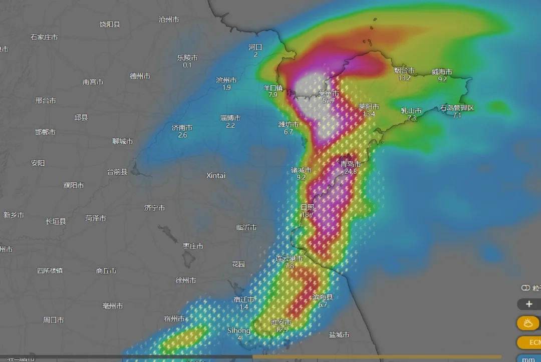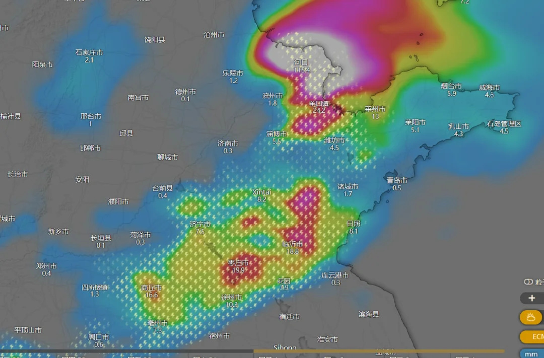 目前气旋暖区降雨仍在滨州、东营等地制造持续性猛烈降雨,而气旋南侧的冷切变线已经来到枣庄、临沂、日照等地,降水强度同样非常凶猛,临沂兰陵车辋站1小时降水量达到87毫米,也是非常少见的凶猛。