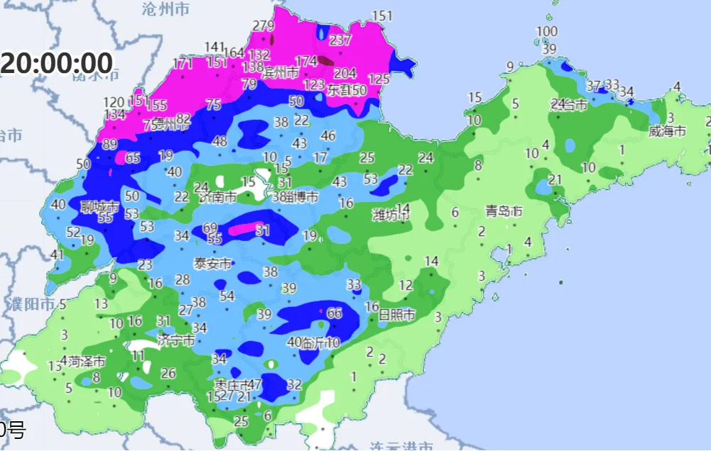 根据山东省气象台的最新统计数据,截止今天晚上20时,全省平均降水量为:34.7毫米,共有1919站出现降水,其中暴雨423个,大雨481个,中雨433个,小雨582个。全省最大降水量为278.6毫米,出现在滨州无棣县碣石山。