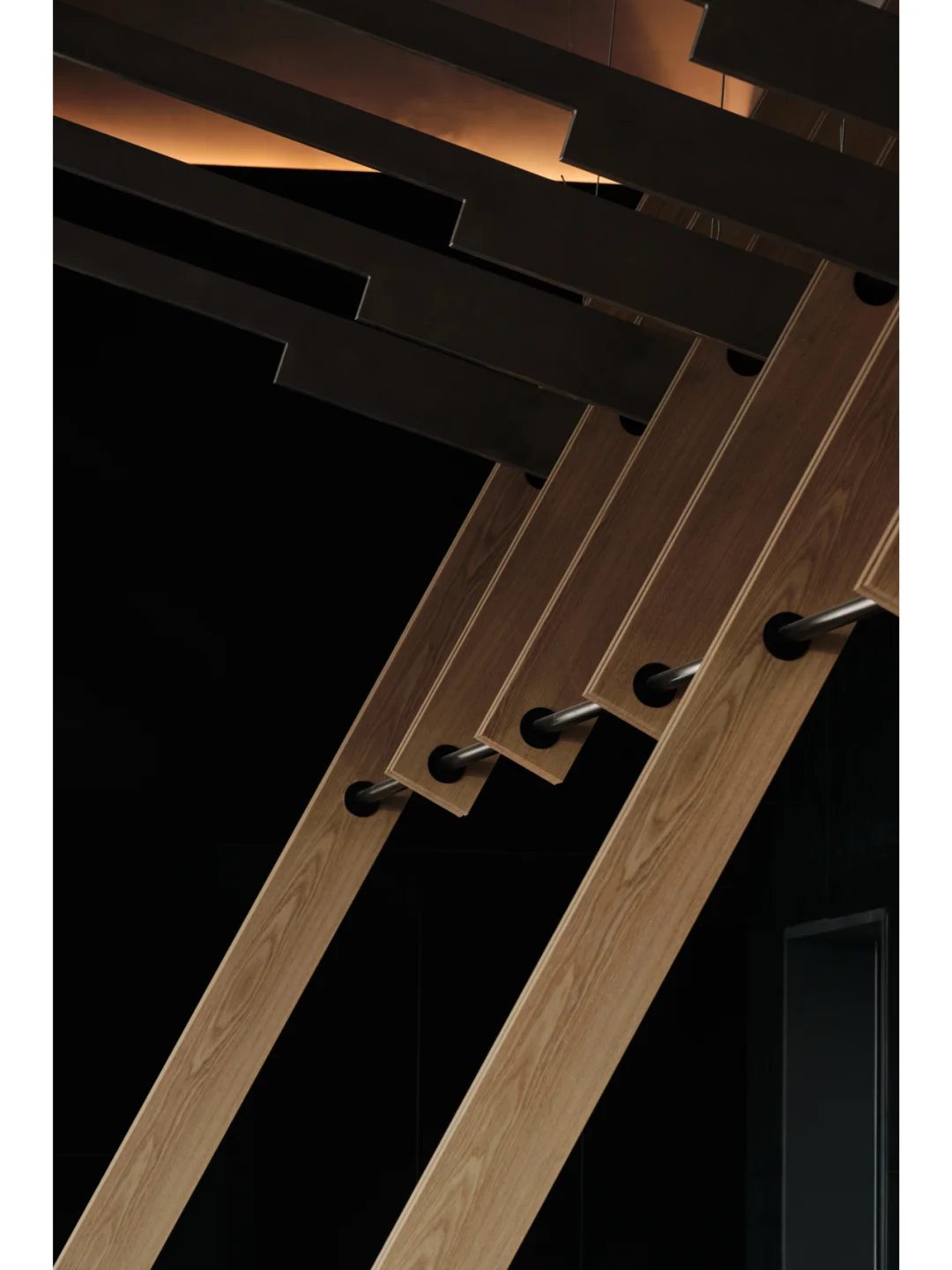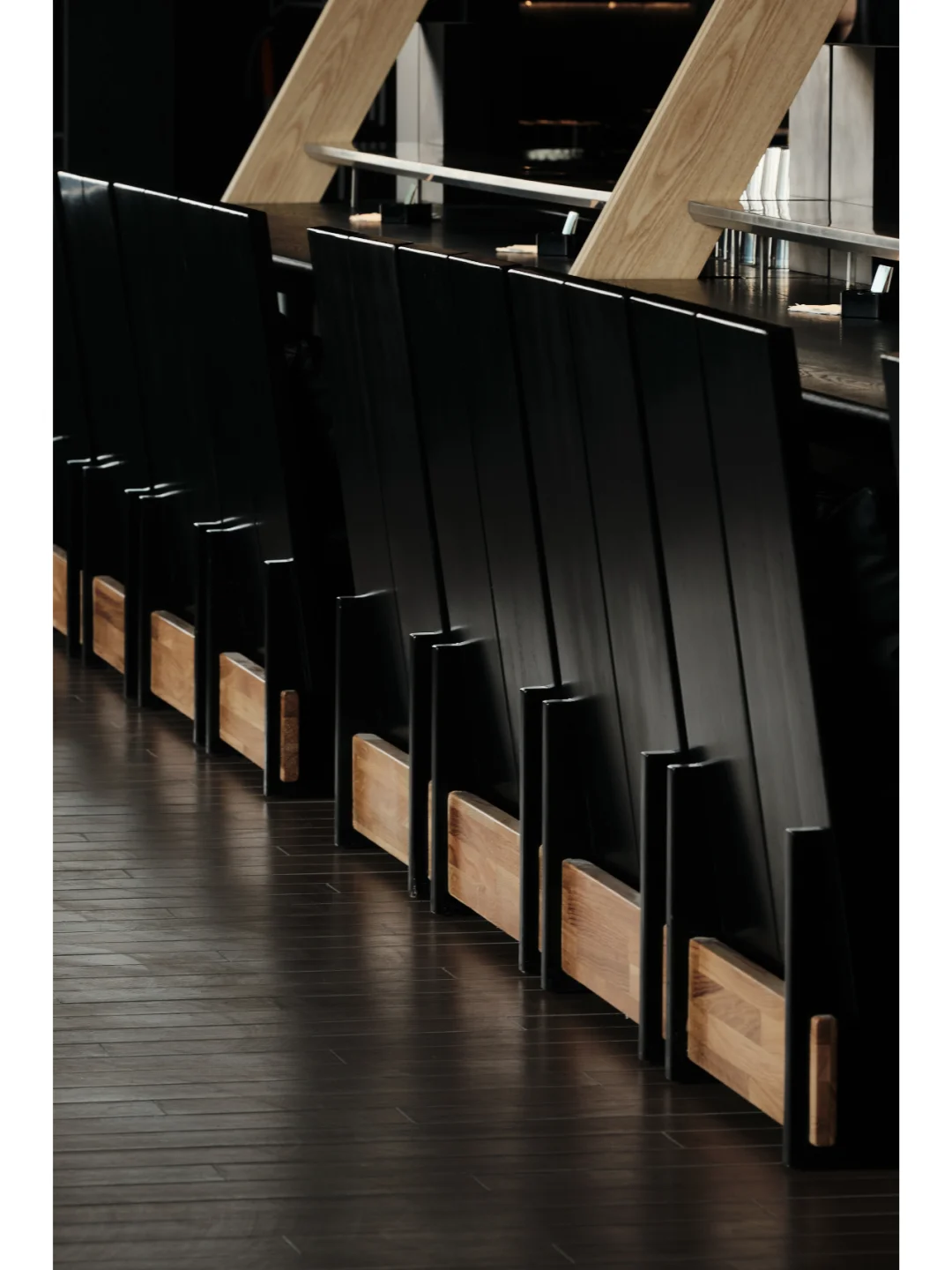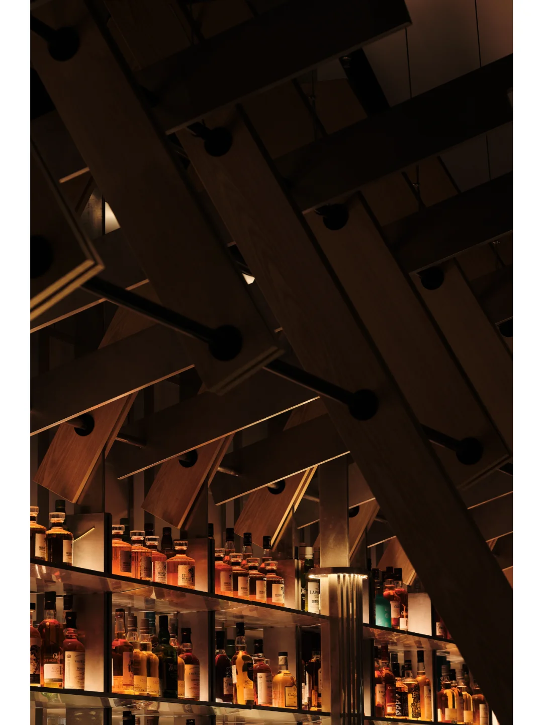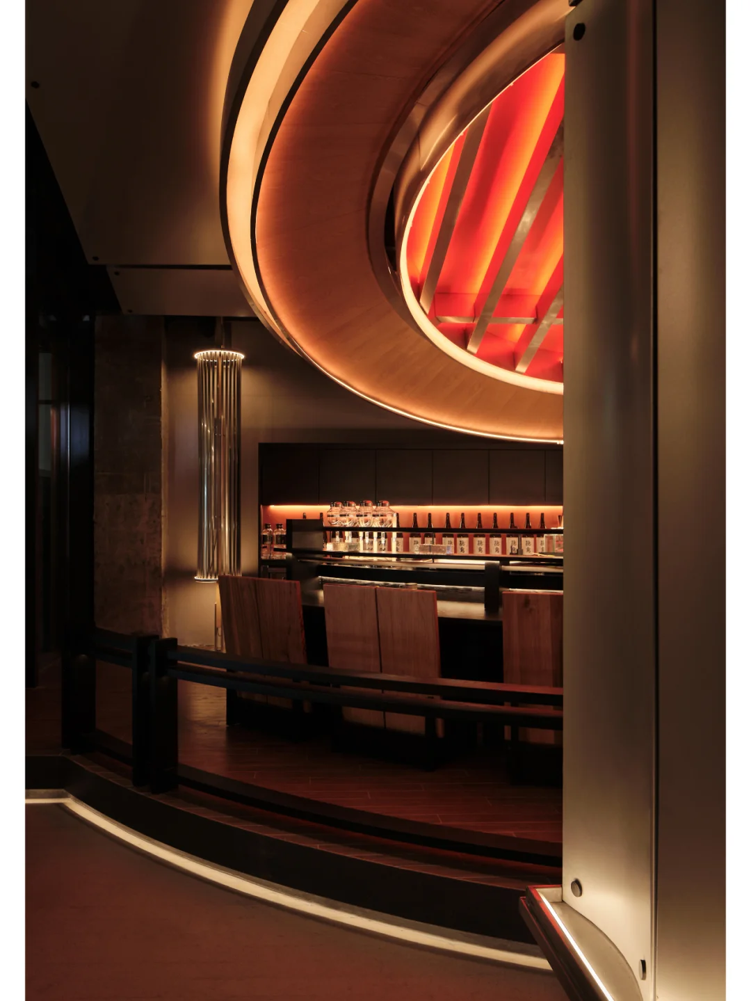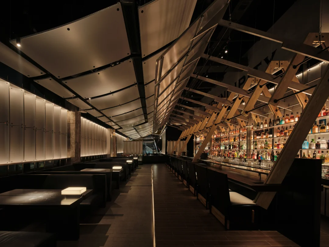 西侧的烧鸟区与东侧的酒吧区在一双羽翼的庇护下,形成了一种相辅相成的和谐氛围,也象征着餐吧对传统与现代、东方与西方文化的包容和融合。室内顶面的造型设计灵感来自于张开的双翼,单侧羽翼采用三层结构,使得翼型结构更加稳定和立体。