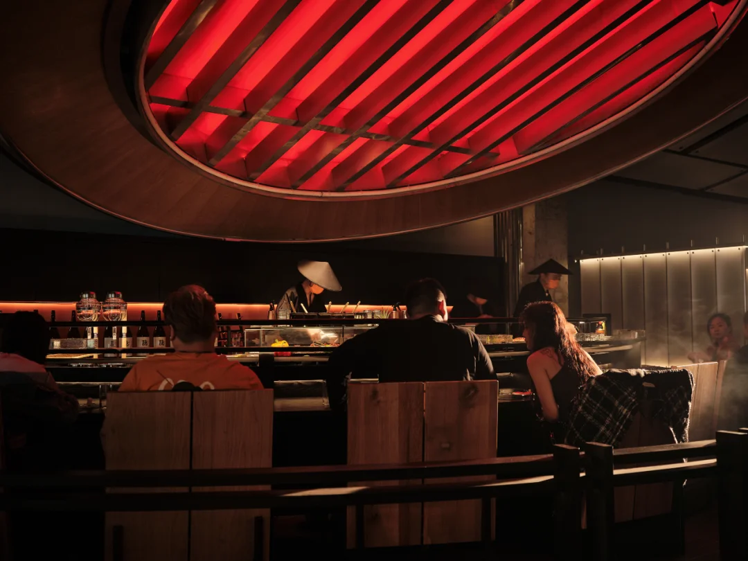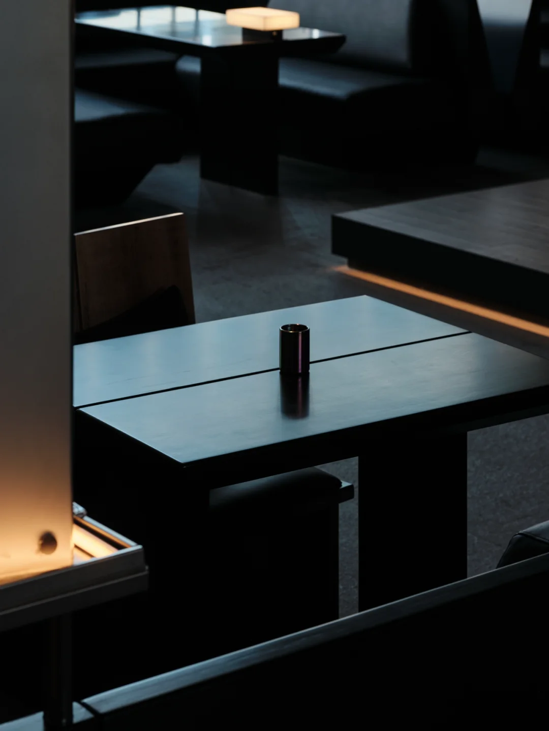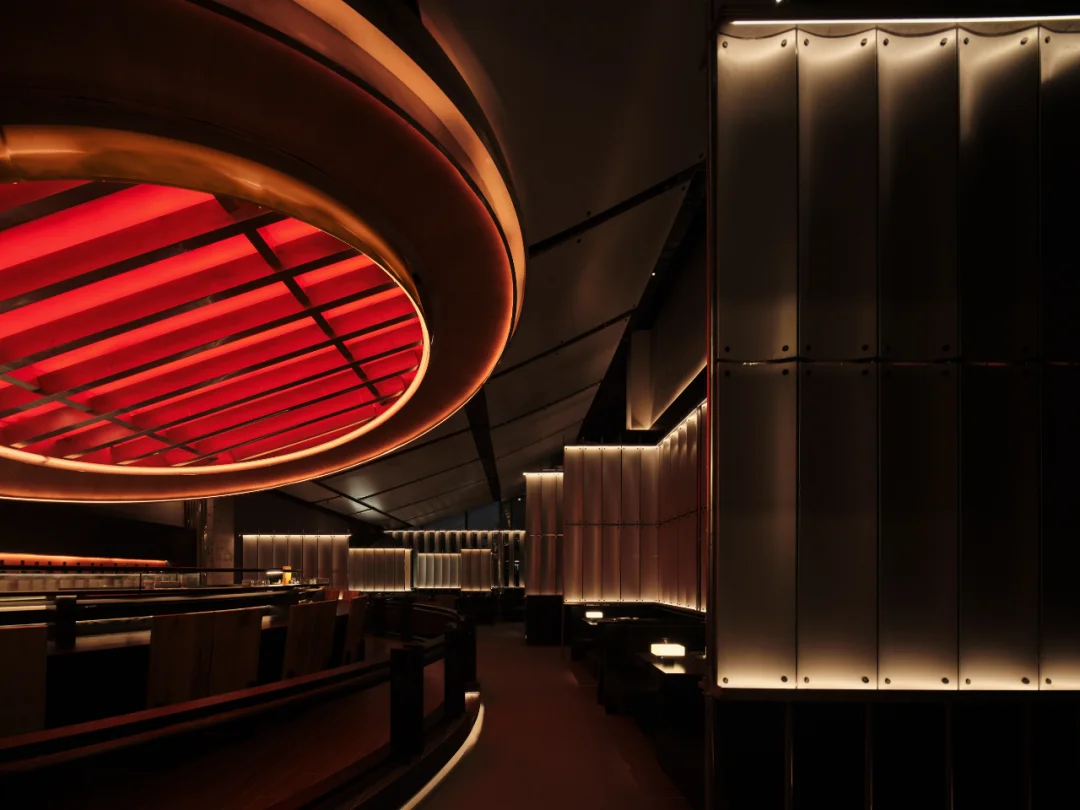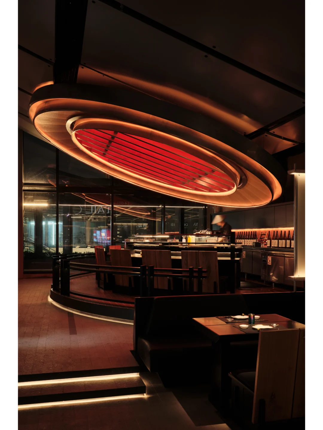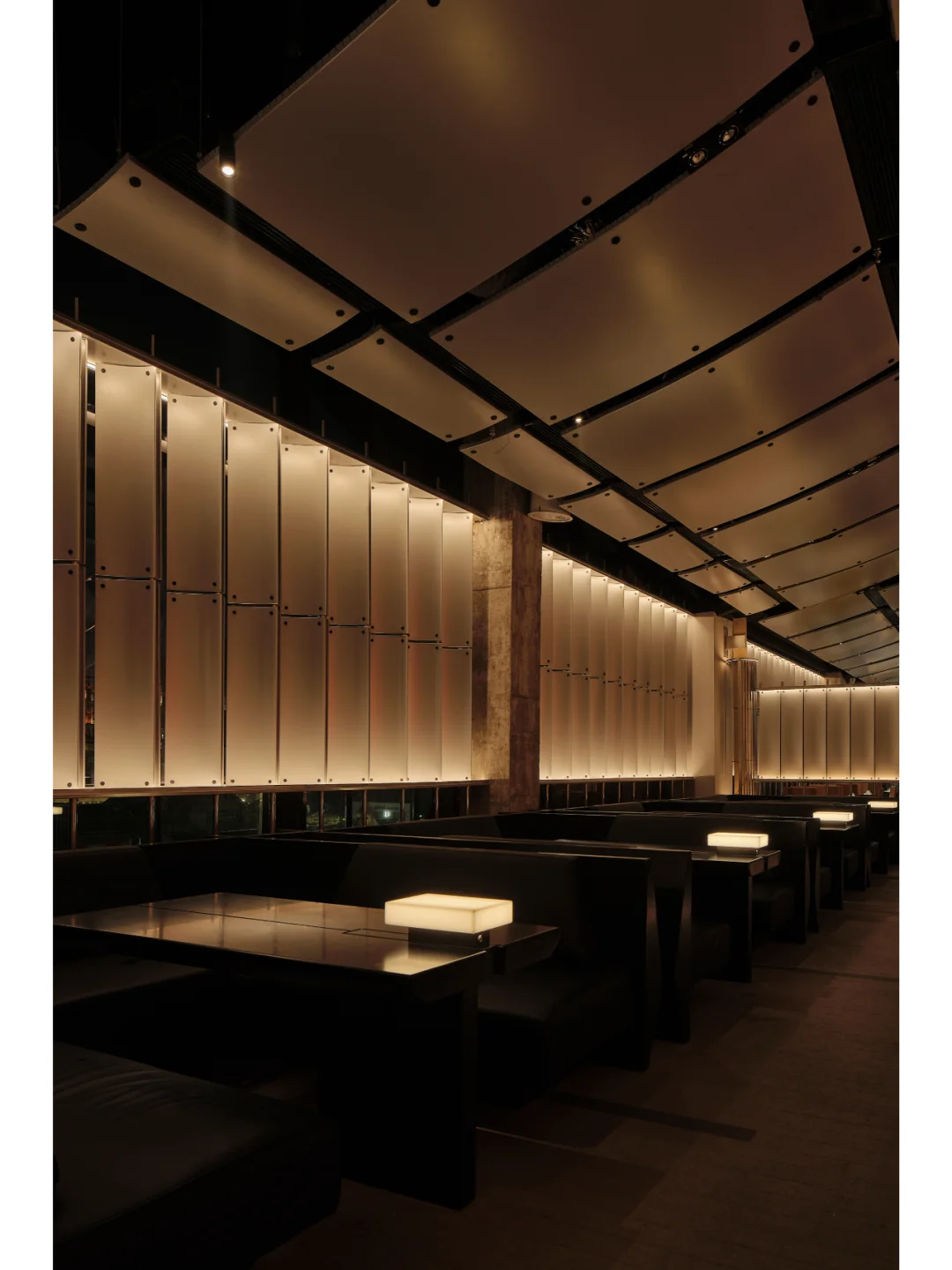 “日本武士”与“羽翼”这两个元素在餐吧的每一个角落都得到了巧妙的体现。银色铝板形似武士铠甲的甲片,通过光影的折射为空间增添了丰富的层次感,也巧妙作为隔断,保证用餐环境的私密性。