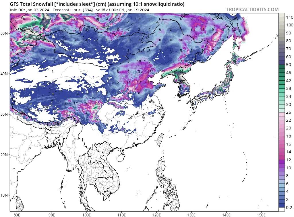 展望中长期的天气形势,1月中旬末-下旬初环流波形西退,乌拉尔山东侧可能有暖脊形成并引导冷空气南下,同时南支槽活跃使我国的水汽条件进一步好转。若冷空气与低空湿润气流配合,1月下旬中东部地区有望出现明显降雪过程,气温也将大幅下降。