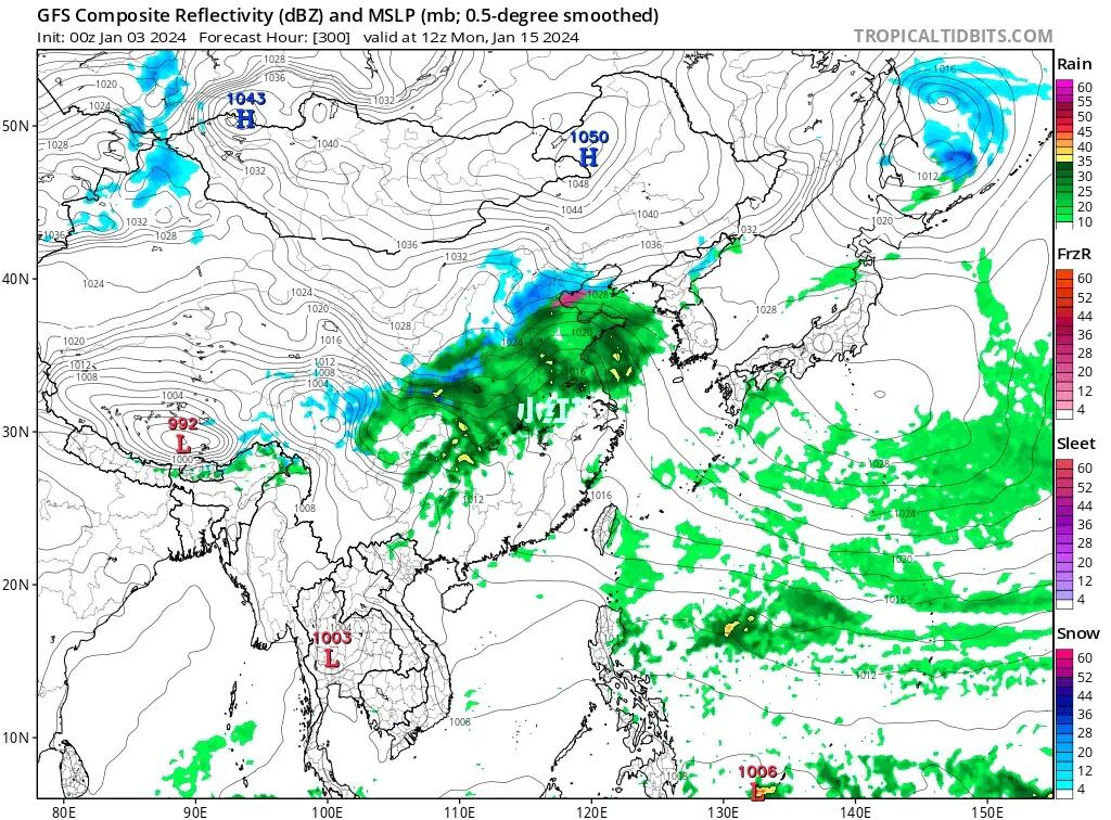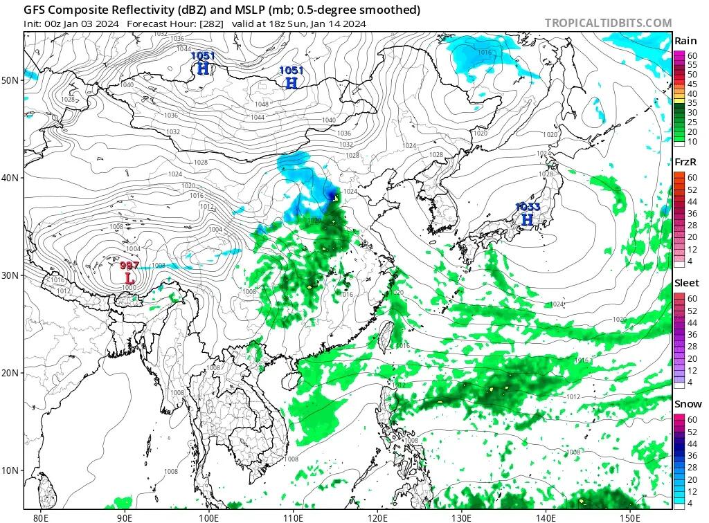 今天下午GFS模式突然调出本月14~16日华北、西北地区东部、东北南部等地将有大范围的雨雪天气,对应的天气形势为南支槽发展与弱冷空气交汇。如图可见,河北、山东、河南北部、北京、天津、陕西北部、辽宁南部等地都将出现明显的降雪天气,而江淮、江南、黄淮南部等地还将有大范围的降雨。