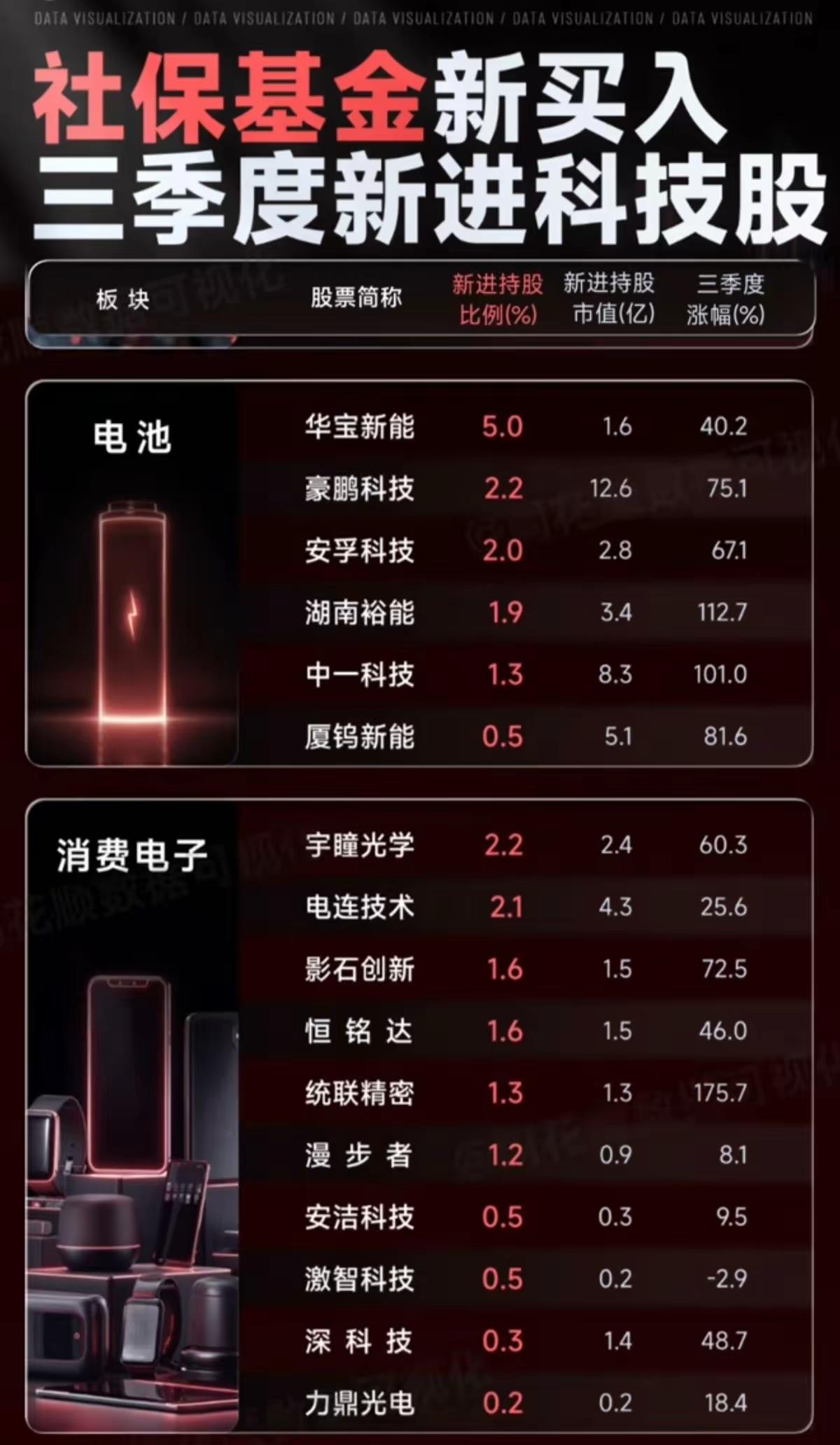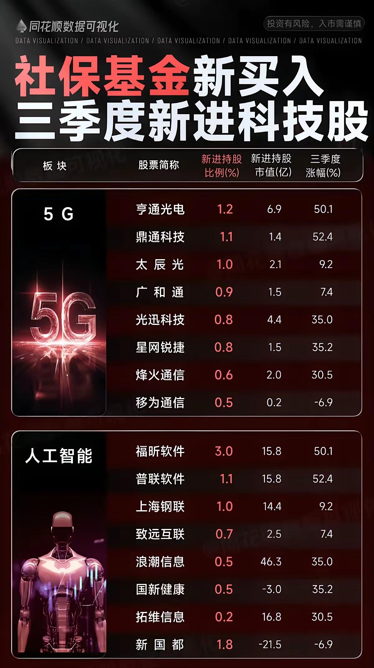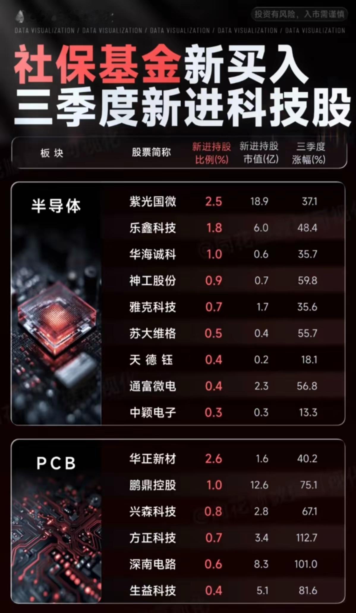 “社保基金新买入三季度新进科技股”的全面总结与分析: 一、总体概况 社保基金在2025年三季度新买入了多个科技细分领域的股票,包括: - 半导体 - PCB(印制电路板) - 电池 - 消费电子 - 5G - 人工智能 这些板块均为当前科技发展的核心方向,显示出社保基金对高成长性科技赛道的高度关注。但需注意:投资有风险,入市需谨慎。 二、各板块重点数据梳理 1. 半导体板块(共8只股票) 股票简称 新进持股比例(%) 新进持股市值(亿) 三季度涨幅(%) 紫光国微 2.5 18.9 37.1 (其他7只股票数据未完全显示,但共有8只,包括紫光国微等) - 特点:社保基金对半导体龙头如紫光国微有显著加仓,该股涨幅达37.1%,显示对其未来发展的信心。 - 整体板块表现较为强劲,多数个股三季度涨幅在30%以上。 2. PCB板块(共6只股票) 股票简称 新进持股比例(%) 新进持股市值(亿) 三季度涨幅(%) 华正新材 2.6 1.6 40.2 鹏鼎控股 1.0 12.6 75.1 兴森科技 0.8 2.8 67.1 方正科技 0.7 3.4 112.7 深南电路 0.6 8.3 101.0 生益科技 0.4 5.1 81.6 - 亮点股票: - 方正科技:涨幅高达112.7%,为新进股票中涨幅最高之一。 - 深南电路:涨幅101.0%,市值8.3亿,显示PCB龙头受资金热捧。 - 鹏鼎控股:虽然持股比例仅1.0%,但市值高达12.6亿,涨幅75.1%,资金关注度高。 - 整体来看,PCB板块三季度表现极其亮眼,多只个股实现翻倍或接近翻倍增长。 3. 电池板块(共6只股票) 股票简称 新进持股比例(%) 新进持股市值(亿) 三季度涨幅(%) 华宝新能 5.0 1.6 40.2 豪鹏科技 2.2 12.6 75.1 安孚科技 2.0 2.8 67.1 湖南裕能 1.9 3.4 112.7 中一科技 1.3 8.3 101.0 厦钨新能 0.5 5.1 81.6 - 高涨幅个股: - 湖南裕能、中一科技:涨幅均超100%,分别为112.7%和101.0%。 - 豪鹏科技:涨幅75.1%,持股市值12.6亿,显示资金对电池赛道持续看好。 - 电池作为新能源核心环节,依然为社保基金重点配置方向。 4. 消费电子板块(共10只股票) 股票简称 新进持股比例(%) 新进持股市值(亿) 三季度涨幅(%) 统联精密 1.3 1.3 175.7 宇瞳光学 2.2 2.4 60.3 电连技术 2.1 4.3 25.6 影石创新 1.6 1.5 72.5 恒铭达 1.6 1.5 46.0 漫步者 1.2 0.9 8.1 安洁科技 0.5 0.3 9.5 激智科技 0.5 0.2 -2.9 深科技 0.3 1.4 48.7 力鼎光电 0.2 0.2 18.4 - 最亮眼个股: - 统联精密:涨幅高达175.7%,为所有披露股票中涨幅最高,新进持股比例1.3%,市值虽仅1.3亿,但表现极为突出。 - 宇瞳光学、影石创新、恒铭达等涨幅均超45%,显示消费电子部分细分领域复苏或创新带动明显。 - 该板块内部表现分化,部分个股仍有负增长(如激智科技跌2.9%),但整体趋势向好。 5. 5G板块(共8只股票) 股票简称 新进持股比例(%) 新进持股市值(亿) 三季度涨幅(%) 亨通光电 1.2 6.9 50.1 鼎通科技 1.1 1.4 52.4 太辰光 1.0 2.1 9.2 广和通 0.9 1.5 7.4 光迅科技 0.8 4.4 35.0 星网锐捷 0.8 1.5 35.2 烽火通信 0.6 2.0 30.5 移为通信 0.5 0.2 -6.9 - 涨幅靠前: - 鼎通科技(52.4%)、亨通光电(50.1%)为新进5G概念中表现最佳。 - 光迅科技、星网锐捷、烽火通信等传统5G设备商也有30%+涨幅,显示行业景气度回暖。 - 移为通信为唯一负增长个股,下跌6.9%。 6. 人工智能板块(共8只股票) 股票简称 新进持股比例(%) 新进持股市值(亿) 三季度涨幅(%) 福昕软件 3.0 15.8 50.1 普联软件 1.1 15.8 52.4 上海钢联 1.0 14.4 9.2 致远互联 0.7 2.5 7.4 浪潮信息 0.5 46.3 35.0 国新健康 0.5 -3.0 35.2 拓维信息 0.2 16.8 30.5 新国都 1.8 -21.5 -6.9