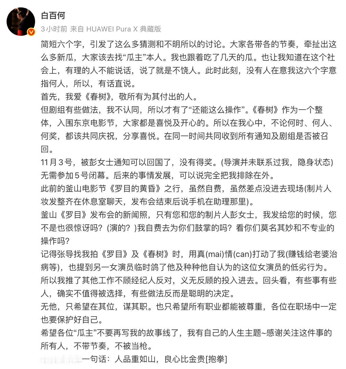 白百何的小作文提取重点: 张律导演想拍电影,没投资,别的演员放他鸽子。他找到白百何,求合作。 白百何表示他是卖惨,说要赚钱给老婆看病。被打动后,白百何拉投资、推掉别的工作,和张律合作了两部电影《罗目的黄昏》和《春树》。 但张律过河拆桥: 第一部戏入围釜山电影节,白百何差点没去成,打电话给制片人,制片人不接,进去发现制片人就在场内,说手机没带,新闻稿也只有导演和制片人照片,没有白百何。 第二部戏在东京电影节上,白百何直接被通知你回去吧,电影没奖。结果她回去后,才知道电影拿奖了,她连坐在那鼓掌的资格都没有。 最后怒斥导演人品差,没良心。