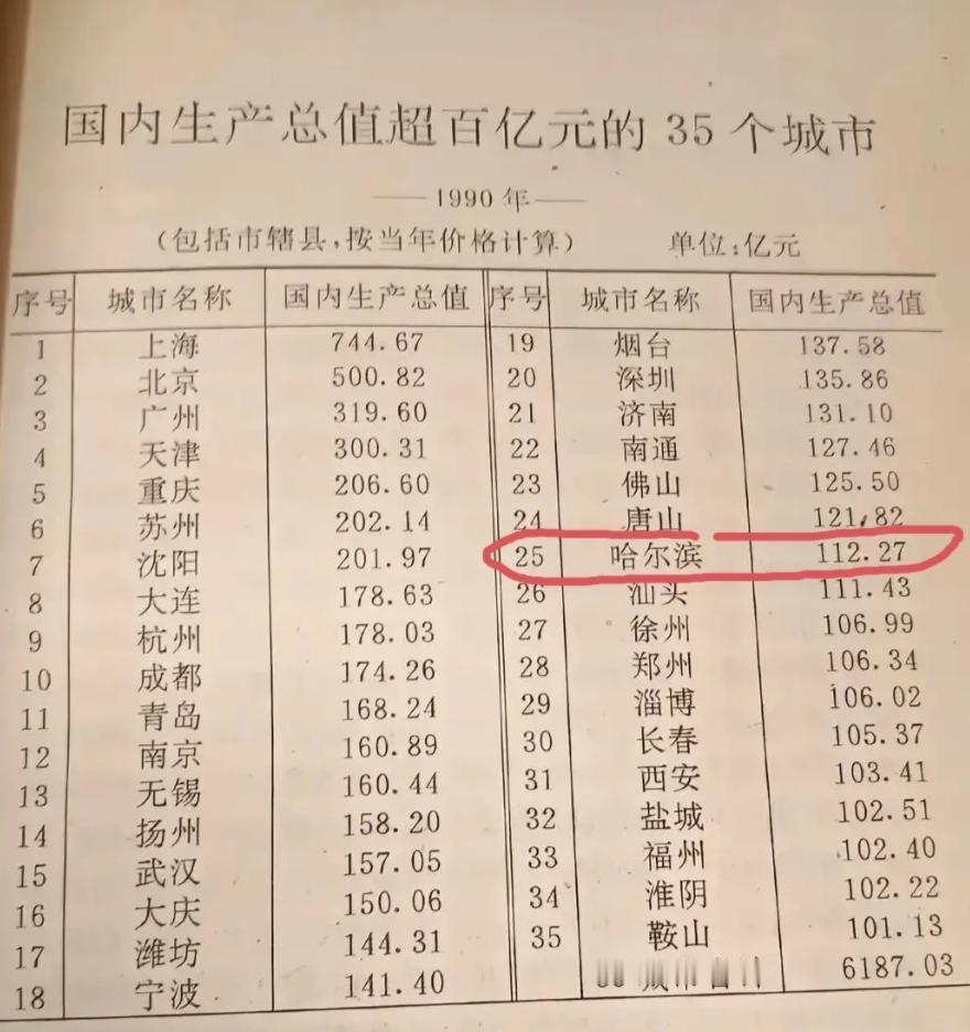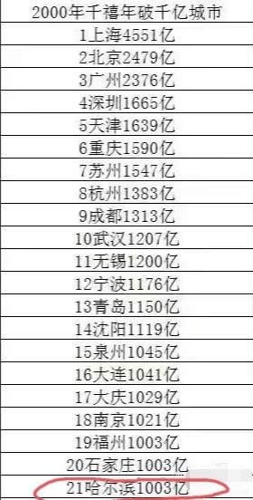 1990和千禧年国内gdp排名最靠前的几十个城市排名对比。其中东北的哈尔滨排名在这十年间居然上升了几位,gdp差不多增加了有十倍之多,随后的200几年,哈尔滨的gdp排名最高来到过十七八位。接着就逐年下滑,最新的他在全国的排名已经掉到了四五十位了! 哈尔滨的排名浮动多多少少跟东北的产业结构和地理位置有关,可好像又跟沈阳、大连这些城市有所不同,他们的排名是一直在下滑,而哈尔滨是90年代末千禧年初有过一段时间的排名上的提升的,后来才一直开始掉下来的。 哈尔滨那些年都发生了什么?有没有了解内情的出来解释一下?