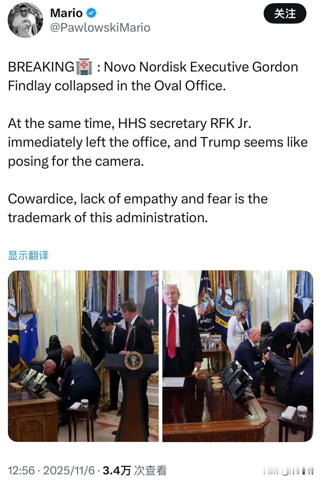 突发新闻 :诺和诺德制药公司(Novo Nordisk)高管戈登·芬德利在椭圆形办公室晕倒。 与此同时,卫生与公众服务部部长小罗伯特·肯尼迪立即离开了办公室,而特朗普似乎在对着镜头摆姿势。 这张照片应该会成为经典。 白宫召集各大制药公司高管讨论的主题是关于降低处方药(特别是减肥药)的价格和扩大药物覆盖范围。 特朗普政府宣布与礼来公司(Eli Lilly)和诺和诺德(Novo Nordisk)达成协议,大幅降低其流行的GLP-1类糖尿病和减肥药物(如 Ozempic、Wegovy、Zepbound 等)的价格。 并且,这些制药公司同意对美国联邦医疗保险(Medicare)和医疗补助(Medicaid)计划,以及通过政府的“TrumpRx”平台直接销售给消费者的药物,提供与其他发达国家最低价格一致的“最惠国待遇”价格。 另外,诺和诺德承诺投资100亿美元扩大其在美国的制造能力。
