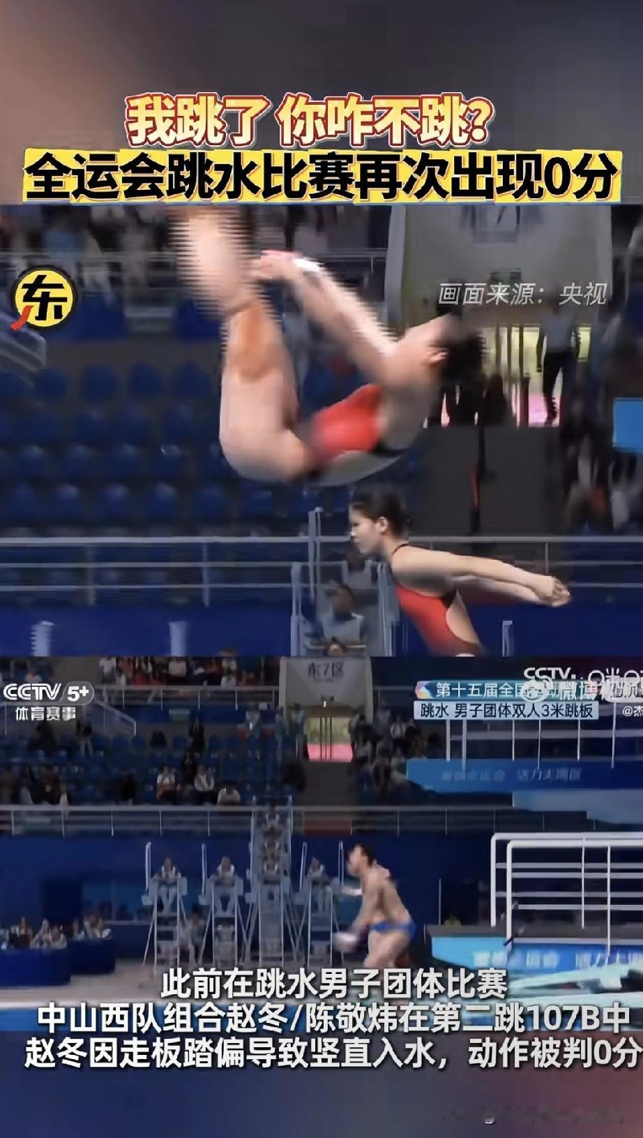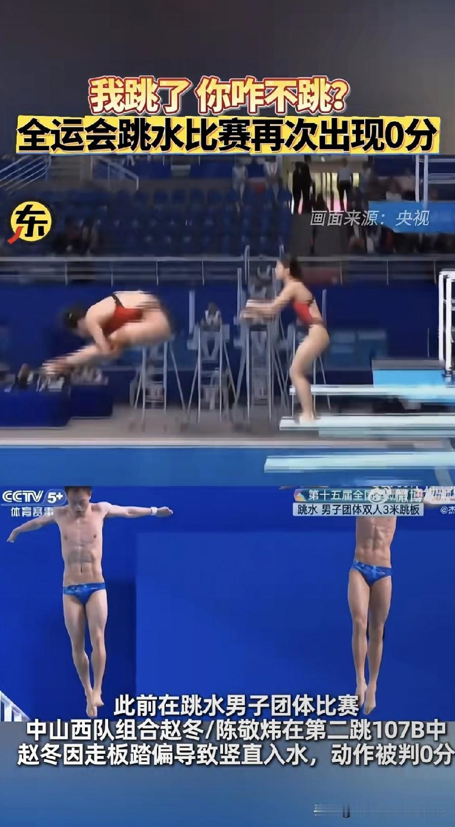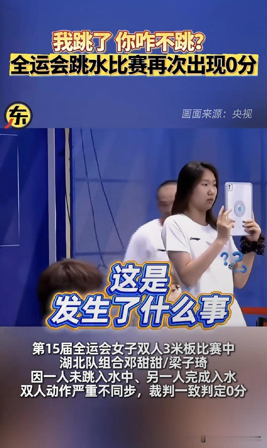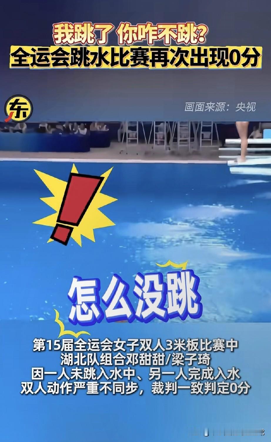 全运跳水赛场疯了!你跳我不跳,裁判直接砸0分! 全运女子双人3米板现场,湖北组合邓甜甜/梁子琦把比赛演成“荒诞剧”:一人纵身跃入泳池,另一人杵在跳板上纹丝不动——这波“你跳我不跳”的操作,直接让裁判齐刷刷亮出0分! 看台上观众都懵了:双人项目拼的就是同步,这波“各玩各的”是紧张懵了,还是赛前没对过暗号?更绝的是,这已经是全运跳水赛场第二例0分,之前山西男队也因走板踏偏拿了鸭蛋。 有人说“运动员压力太大能理解”,也有人吐槽“这是职业选手该犯的错?” 你们觉得:这种离谱失误,到底是意外还是准备不足