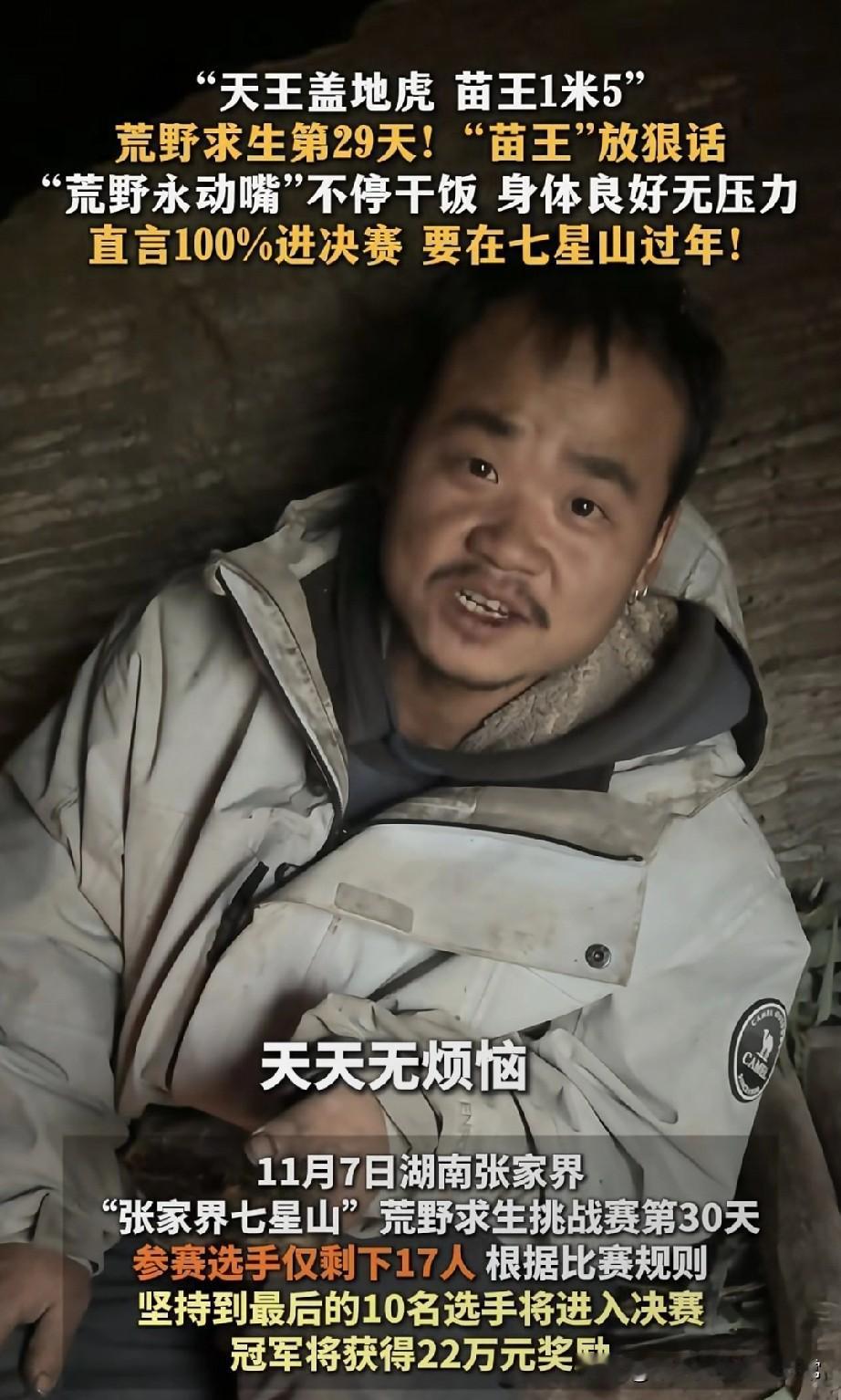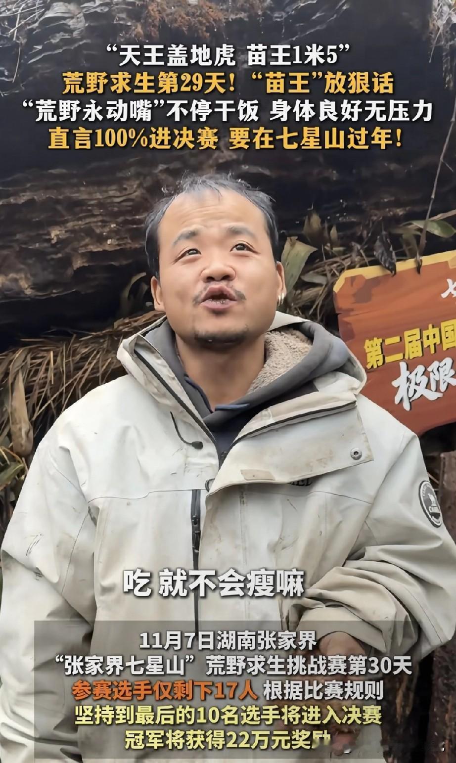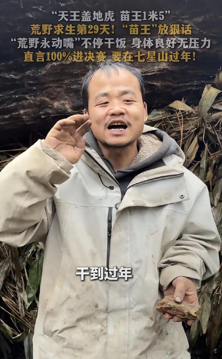 苗王我要在山里过年!炫饭炫出优越感,决赛稳了! 张家界七星山荒野求生第30天,选手“苗王”把节目整成了“干饭真人秀”——别人饿到眼冒金星,他蹲在临时窝棚里啃东西,嘴就没停过,还拍着肚子笑:“吃就不会瘦嘛!” 被问冲决赛有没有信心,他眼皮都没抬:“这还用考虑?身体好得很!”更狂的是,他举着手里的野货喊:“准备在这七星山过年了!” 现在选手只剩17个,决赛要留10个,网友吵翻了:有人说他心态是真牛,荒野求生拼的就是耐力;也有人吐槽“这哪是求生,明明是带薪进山度假”。 你们觉得:他这“躺赢式求生”,到底是实力还是节目剧本