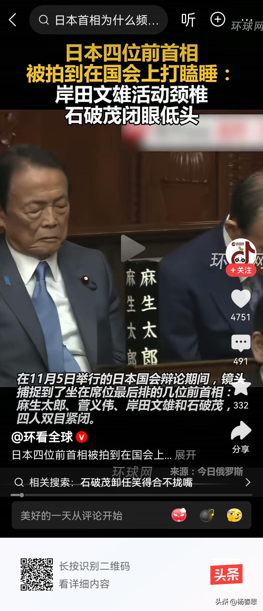 4位前日本首相在国会开会被拍到打瞌睡。其实这也说明日本的政客的基础是怎么来的是吧,他们上来了就会坐到死,只要不死一直在台上。这也代表着日本的政治文化是那么的死,没有活力代表着日本的国家可见一斑。这种情况相当于以前大国的封建社会啊,都是垄断权力垄断传承,所以日本年轻人,没有活力,没有朝气,没有希望,就在这里。