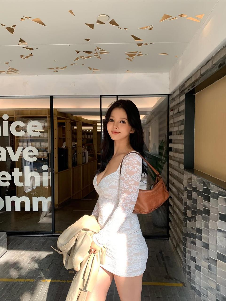 这位小姐姐身着白色蕾丝连衣裙, 长发披肩,笑容温婉。 她站在玻璃门前,一手轻挽米色外套, 肩上挎着棕色小包,姿态优雅 。阳光洒在她身上, 与身后店铺的暖光相映, 尽显温柔气质,仿佛自带柔光滤镜, 让人眼前一亮。