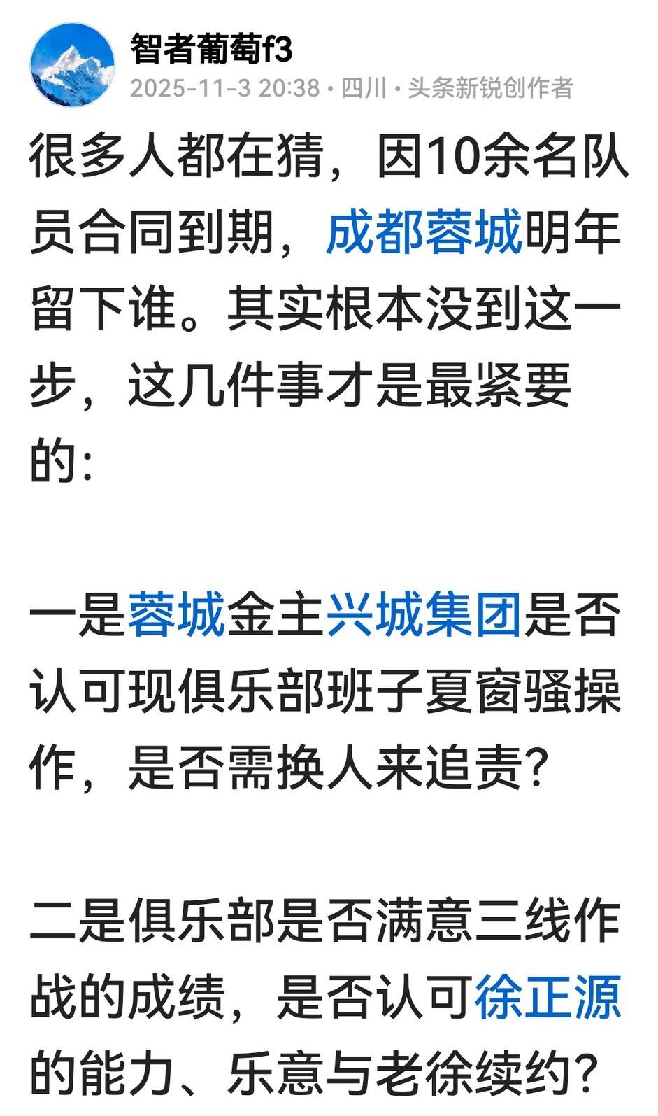 成都蓉城俱乐部又要换董事长?如是,估计大多数蓉迷感觉比赢一场球过瘾。 作为中超后起之秀,蓉城这几年排第五~第三名,亮度惊人。单讲成绩,俱乐部董事长前任朱澜波最为优秀,现任俞扬带领,国内成绩与去年持平,亚冠也算还行。 但今年的引援,韩鹏飞是炸弹,廖力生不及预期,卡隆就是玻璃人。特别是夏窗引援为零还放走6人,导致老徐在替补席摆一排娃娃兵,关键场次总差个一锤定音。联赛最后掉链子,俞抑应该承担主要责任。 早在几天前球迷探讨续约球员时我就讲过,排第一位的是兴城集团是否追责换人,现在果然这个话题浮出水面,不知这报道可否当真?