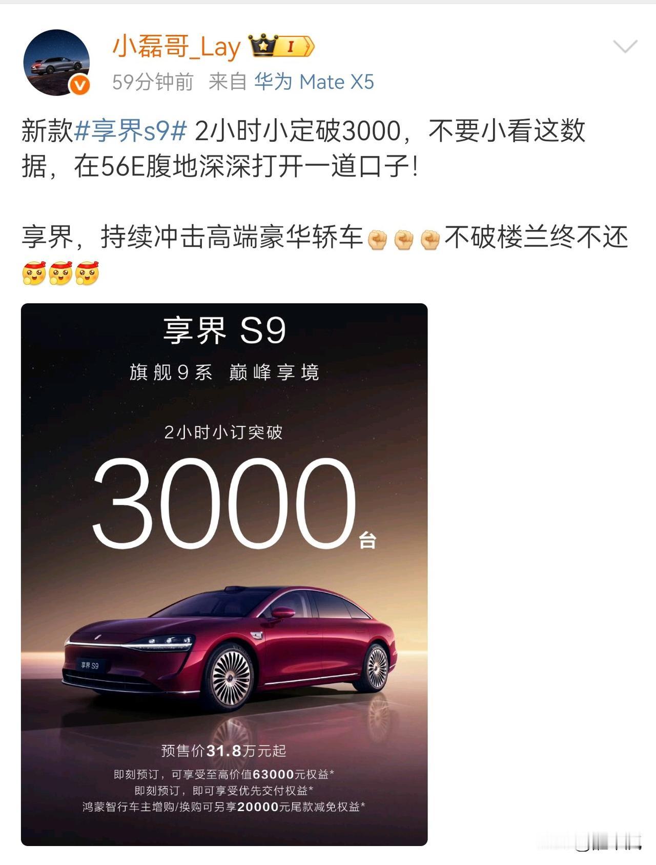 享界新S9,不及预期啊! 还是有点啦!两小时小定才3000? 还不到享界S9T的三分之一! 冲击BBA的56E高端轿车市场, 两年了鸿蒙智行还是没有破局, 实在不行,让问界下场做轿车吧!