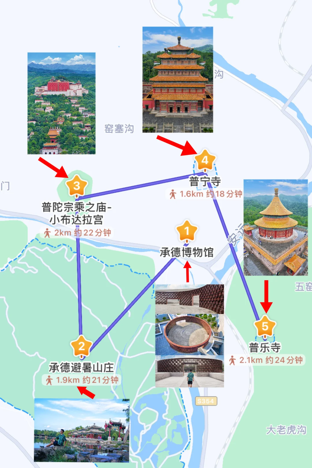 🚶♂️游览路线:丽正门进➠避暑山庄博物馆➠环山车(共3站,第2站在长城处可俯瞰“小布达拉宫”全景)➠烟雨楼➠万树园门出