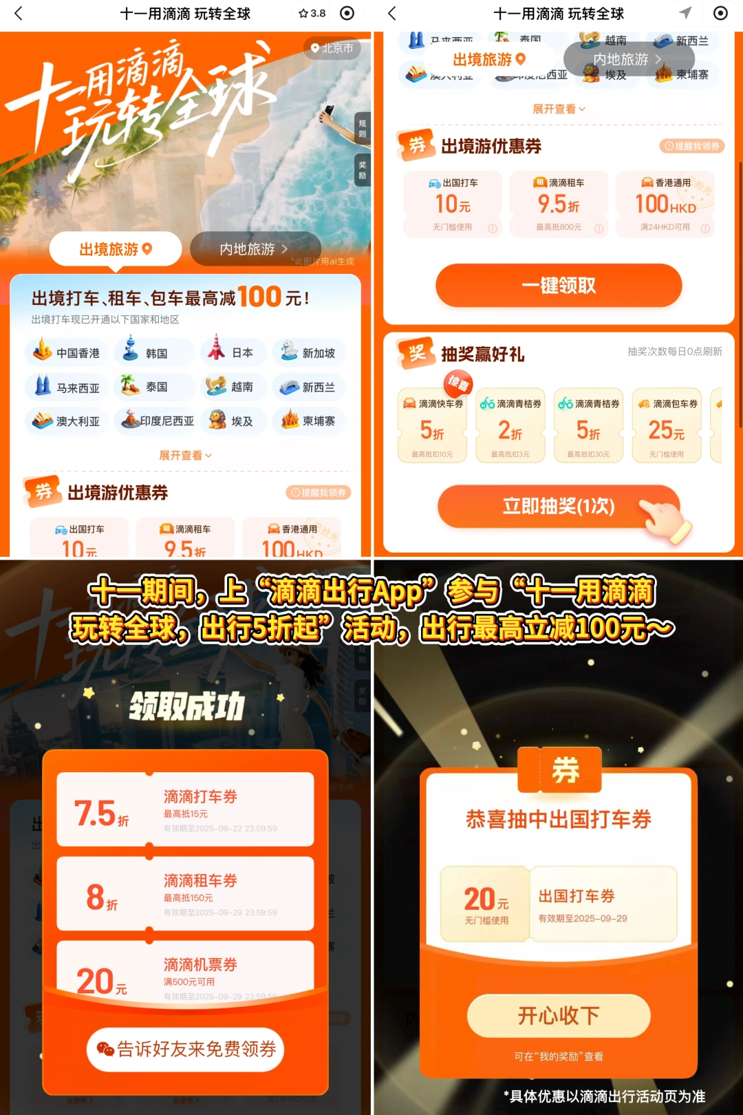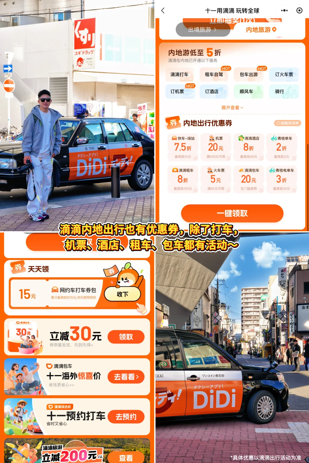十一期间上App参与“十一用滴滴玩转全球,出行5折起”活动,还能领取优惠~全程不用重复下载不用换手机号,车费直接线上预付,汇率自动算好,压根不用特意换日元。打车时在App里就能用中文跟司机沟通路线,选包车更方便,中文界面配中文司机,查路名、说目的地都毫无障碍。从大阪城公园去通天阁,叫车省时不费腿,把精力全留给逛吃玩😋