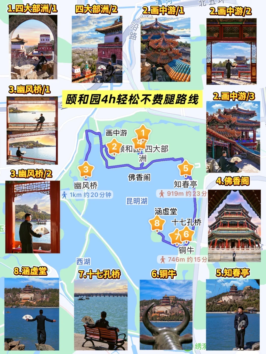 北宫门进➟苏州街➟四大部洲➟画中游➟豳风桥➟佛香阁➟知春亭➟铜牛➟十七孔桥➟南湖岛➟涵虚堂➟新建宫门出