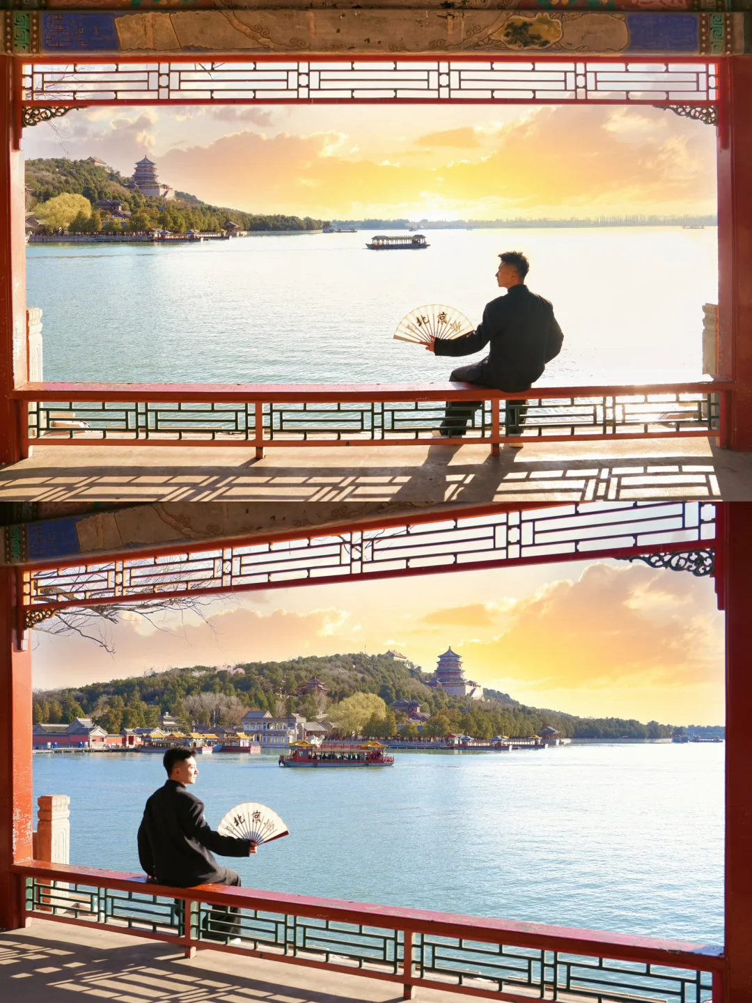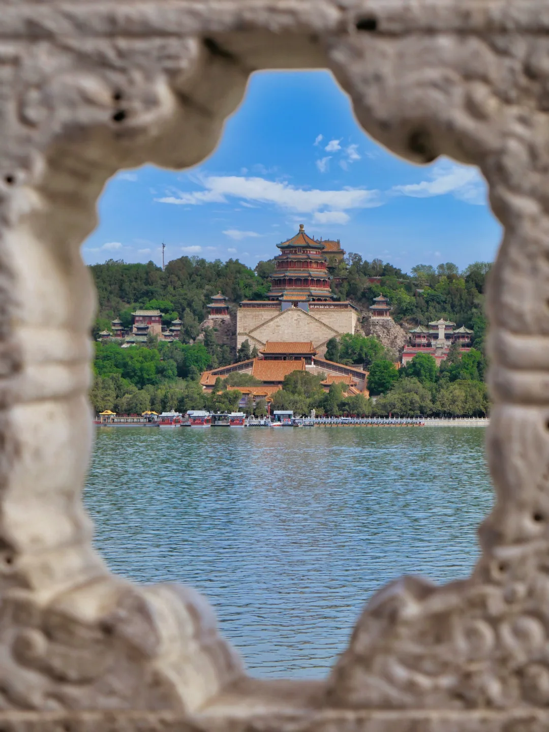 对面正对佛香阁与万寿山,可以用石栏空隙为前景拍万寿山与佛香阁同框图;假山上还可以拍到正对佛香阁同框机位