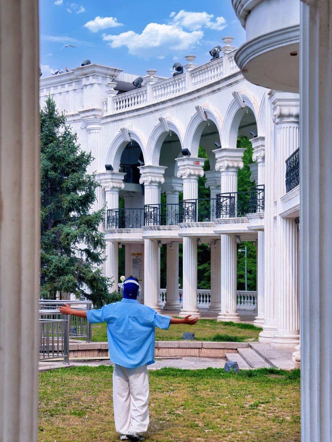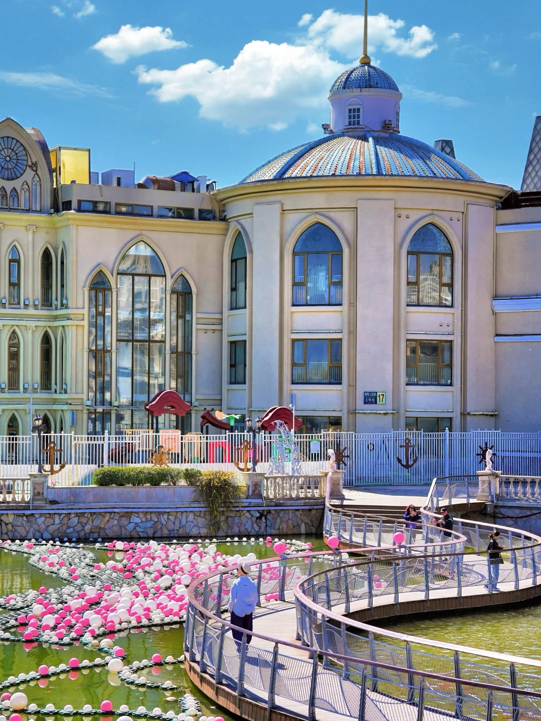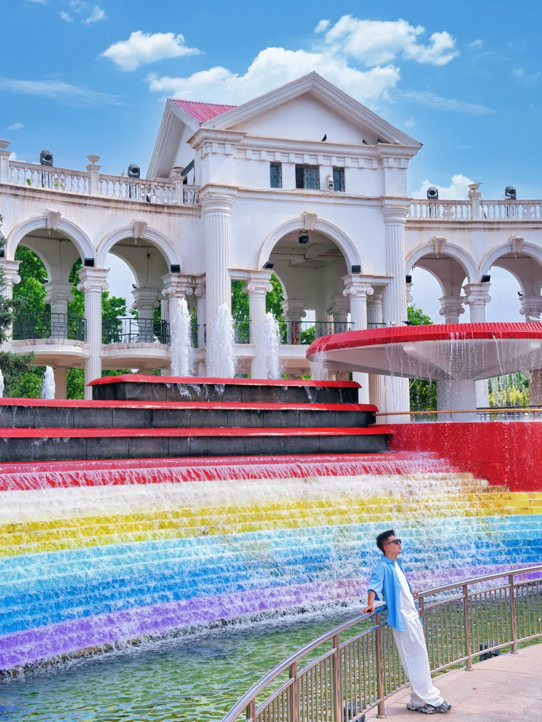 白色的欧式建筑,彩虹阶梯和白色连廊