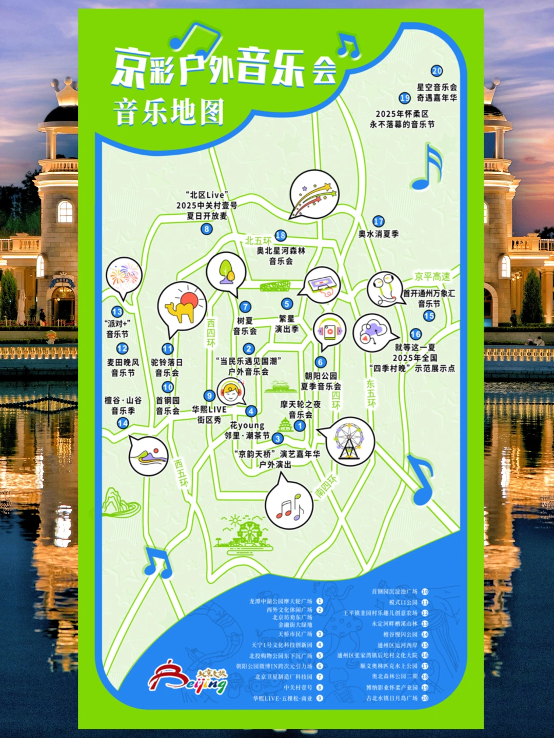 📆8.23-8.24晚,朝阳公园、首钢园、奥北中央公园(奥北森林公园二 期)三个地点,不仅可沉浸零距离感受音乐现场魅力,还有精彩有趣的小活动可🆓领🎁哦~此外京彩户外音乐会共有20个音乐会点位(附京彩户外音乐会地图🗺️p16),打卡3个京彩户外音乐会地点,带京彩户外音乐会 京彩夏日 北京范儿 来北京要做的十件事 话题,即可参与线上活 动,还有机会领取礼物🎁哦~