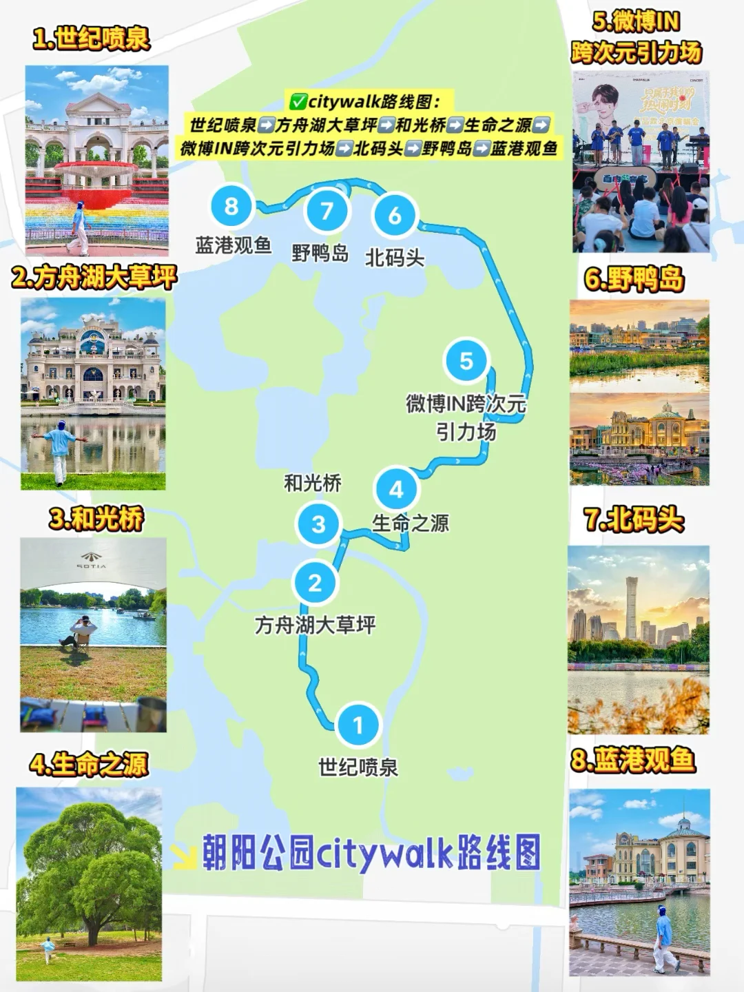 世纪喷泉➡️方舟湖大草坪➡️和光桥➡️生命之源➡️weibo IN跨次元引力场➡️北码头➡️野鸭岛➡️蓝港观鱼