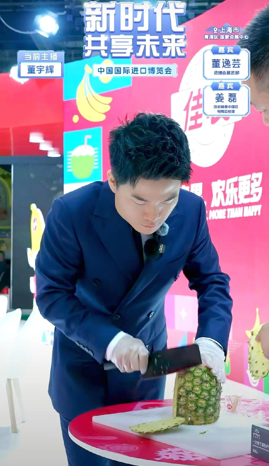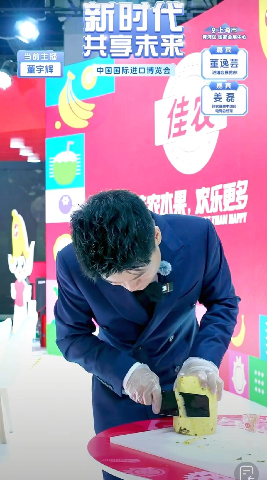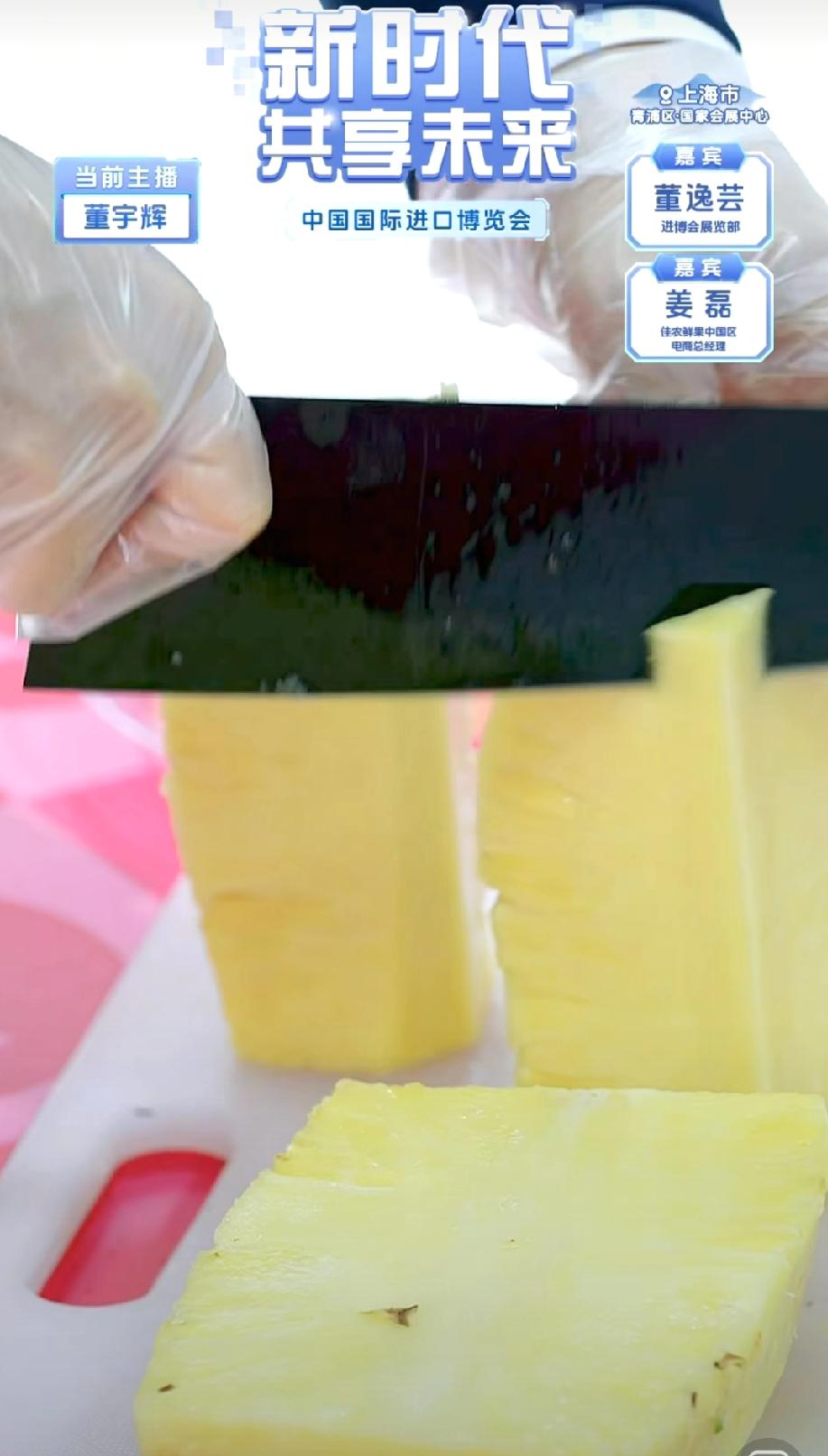 董宇辉逛了一晚上,讲了一晚上,也吃了一晚上,到佳农水果又干起了活,现场削了一个凤梨。 在老师的指导下,按步骤进行,先掐头去尾,再削皮,再中间一分为二,再细分几份,再去芯,再将果肉切成小块。 看董宇辉的操作,我又学会了一项新技能,菜刀削凤梨。 看董宇辉的动作一气呵成,刀工是相当了的好,可见平时没少下厨。最佩服的就是他这个,没有他不会的,都说人无完人,有时候感觉他就是那个特殊的完美的人。 董宇辉 与辉同行