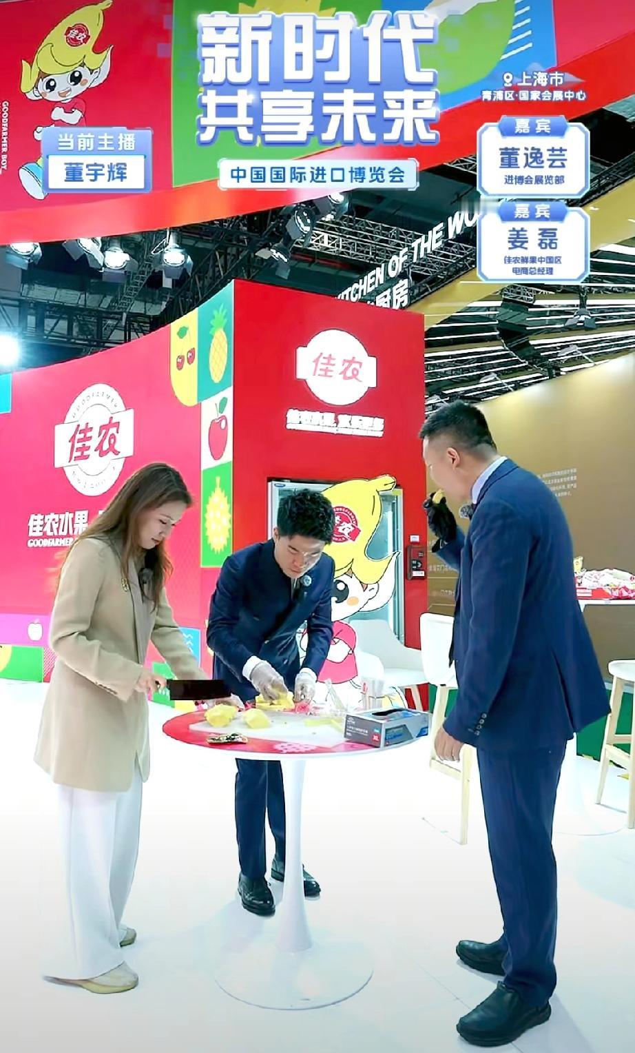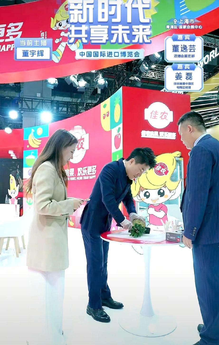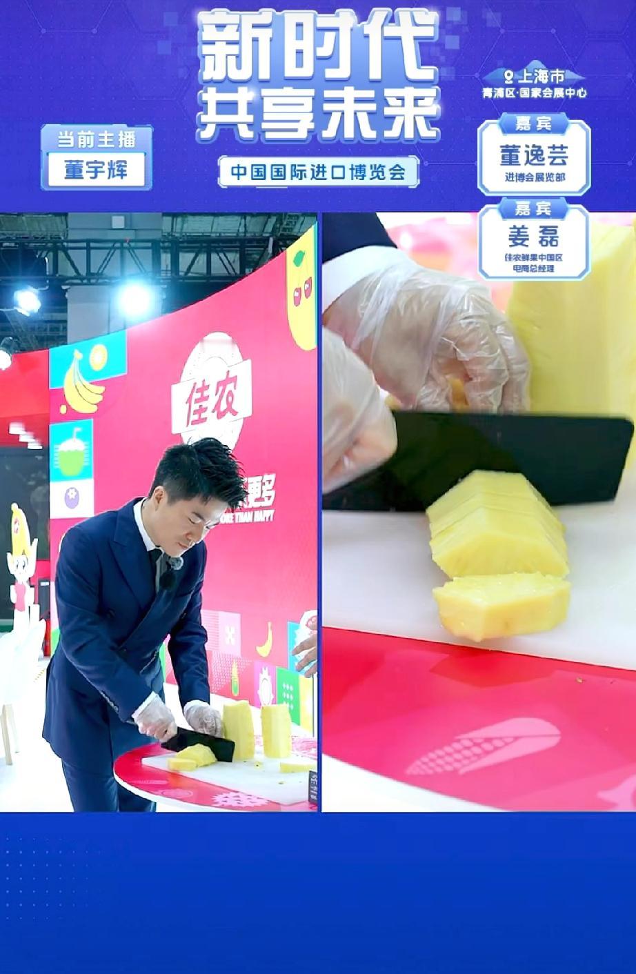 董宇辉逛了一晚上,讲了一晚上,也吃了一晚上,到佳农水果又干起了活,现场削了一个凤梨。 在老师的指导下,按步骤进行,先掐头去尾,再削皮,再中间一分为二,再细分几份,再去芯,再将果肉切成小块。 看董宇辉的操作,我又学会了一项新技能,菜刀削凤梨。 看董宇辉的动作一气呵成,刀工是相当了的好,可见平时没少下厨。最佩服的就是他这个,没有他不会的,都说人无完人,有时候感觉他就是那个特殊的完美的人。 董宇辉 与辉同行
