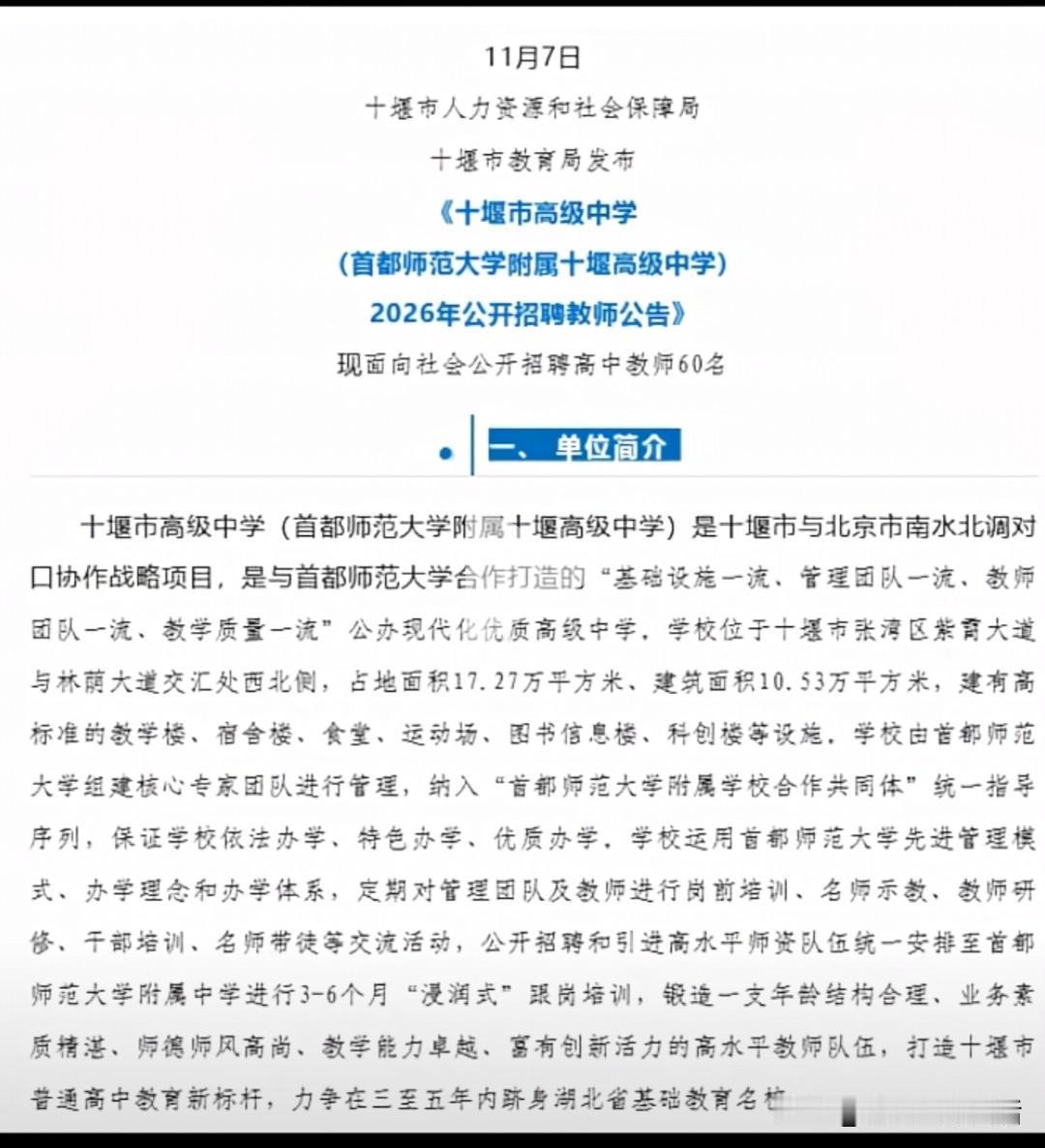 十堰新高中发布教师招聘 十堰市高级中学位于张湾区紫霄大道与林荫大道交汇处西北侧,占地面积将近17万平方米,是一所现代化优质的公办高中。 学校的建设是十堰市与北京市南水北调对口协作战略项目,由首都师范大学与十堰市联合打造,计划三至五年内跻身湖北省基础教育名校行列。目前学校正在招聘首批教师,值得一提的是,学校对新教师的培养机制尤为用心。新入职的教师据说会被安排至首都师范大学附属中学进行3-6个月的沉浸式跟岗培训,在名师的引导下快速的成长起来。这种名师带徒的模式,不仅能快速培养教师的专业素养,更让他们把首都师范大学先进的教学技术带回十堰,形成良性的教育循环。 本次计划招聘60名老师。这不仅是一次简单的教师招聘,更是一场跨越千里的教育合作。十堰市高级中学将会是一所集基础设施一流、管理团队一流、教师团队一流、教学质量一流的现代化高中。学校不仅硬件设施齐全,更引入首都师范大学的管理模式,为学生提供全方位、高质量的教育资源。 相信此举会让十堰市的教育更上一个台阶,我们也相信十堰市的教育会越来越好。让我们期待在首都师范大学与十堰市共同点的努力下,这所学校会成为湖北省的名校。也期待更多的学子能够这里实现人生的梦想! 你们知道这所学校的招生政策吗? 十堰中小学 十堰学校 湖北教师招聘 十堰中学 十堰市高中 张湾区教师招考 十堰中公教育