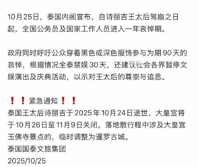 泰国诗丽吉太后去世:禁娱30天所有的活动只能穿深色和黑色服饰,虞书欣穿绿色