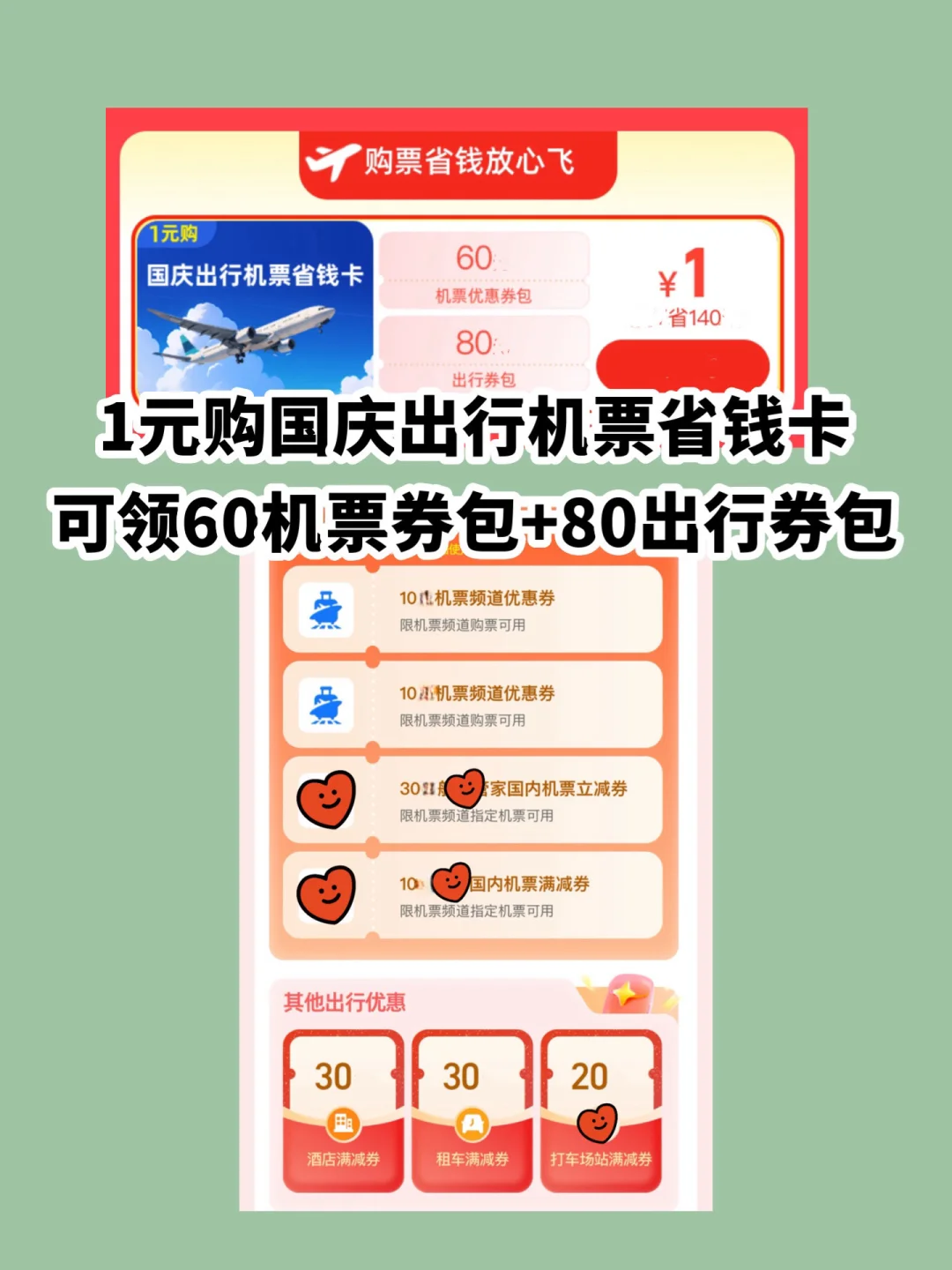 ❷下方有“购票省钱放心飞”,1元可以换到60机票券+80出行礼包!这样订机票、酒店,打车都可以再减一笔!