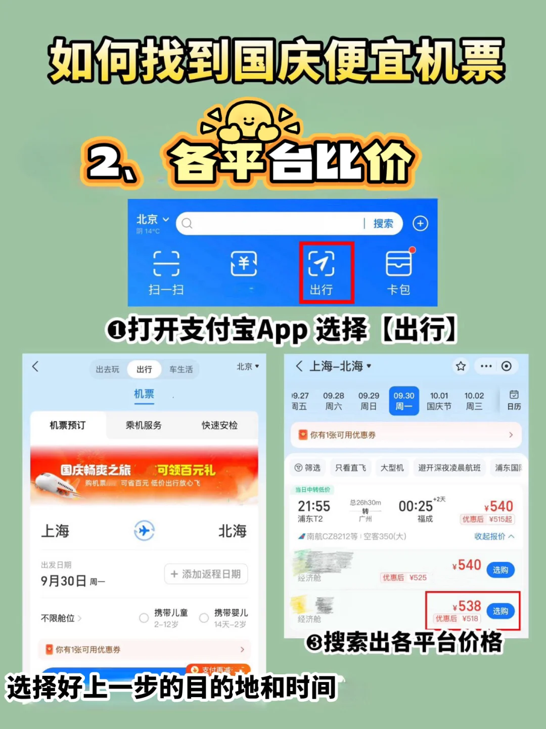 同样使用支付宝App,找到如图【出行】入口!输入上海-北海!9月30日!搜索这时候你能发现比价后有个渠道518元!